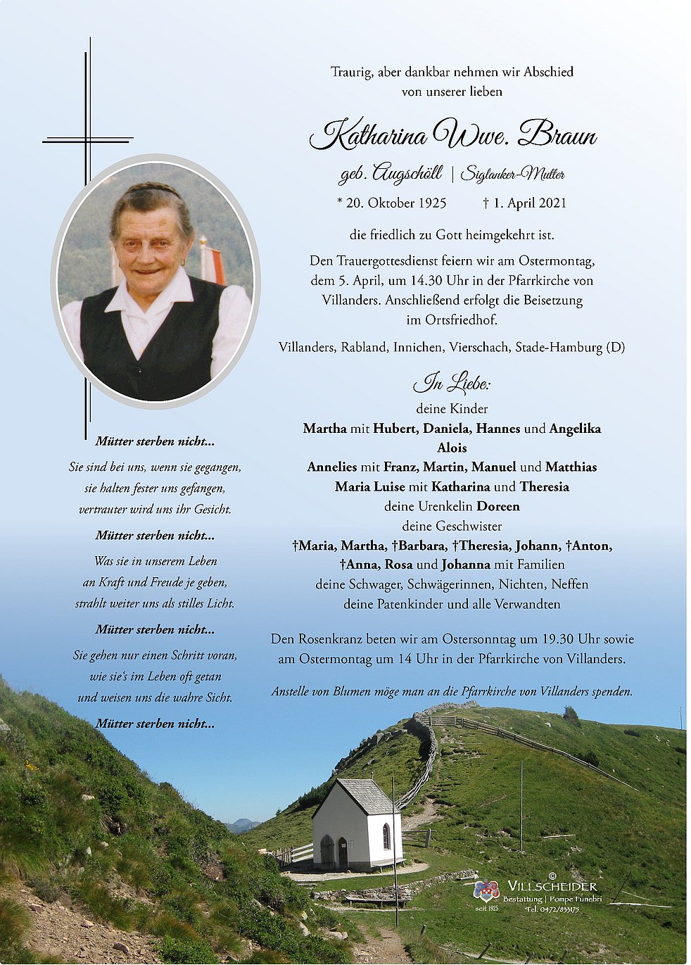 Unser aufrichtiges Beileid am schmerzlichen Verlust eurer Mama, die ihr so lange und liebevoll dahuam umsorgn hobs kennt. I erinnere mi gern an die Besuche bei enk mitn Tata in sein geliebten Villanders. Fühlt enk umormt in der schwierigen Zeit. A von Mama Rosl liabe Griaß und Anteilnahme