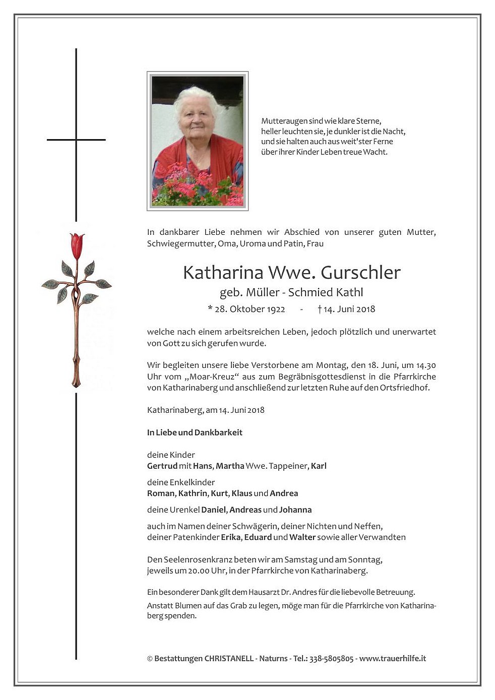 Wir begleiten unsere liebe Verstorbene am Montag, den 18. Juni, um 14.30 Uhr vom „Moar-Kreuz“ aus zum Begräbnisgottesdienst in die Pfarrkirche von Katharinaberg und anschließend zur letzten Ruhe auf den Ortsfriedhof.
