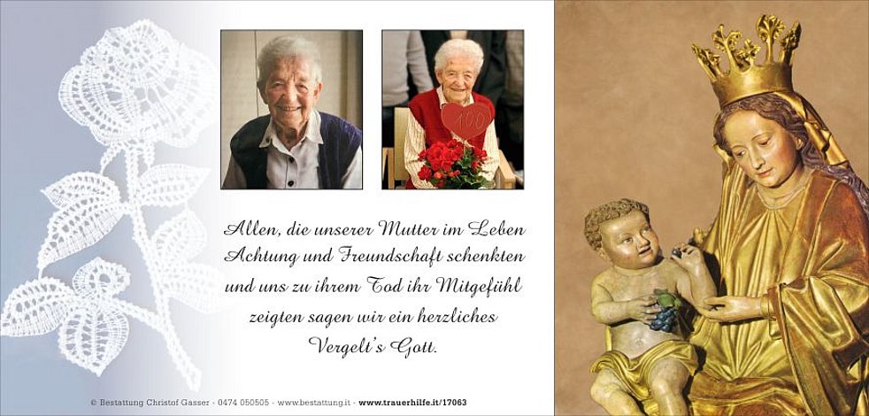 Ein besonderer Dank gilt dem ehemaligen Hausarzt Dr. Martin Kofler und dem gesamten Personal vom Wohn- und Pflegeheim Bruneck WB 5 für die liebevolle Betreuung sowie allen, die ihr Gutes getan haben.