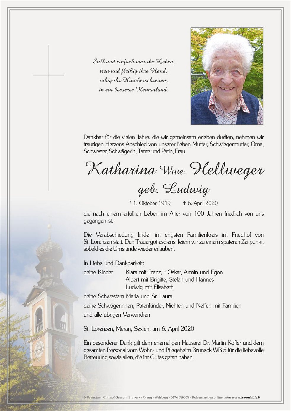 Die Verabschiedung findet im engsten Familienkreis im Friedhof von St. Lorenzen statt. Den Trauergottesdienst feiern wir zu einem späteren Zeitpunkt, sobald es die Umstände wieder erlauben.