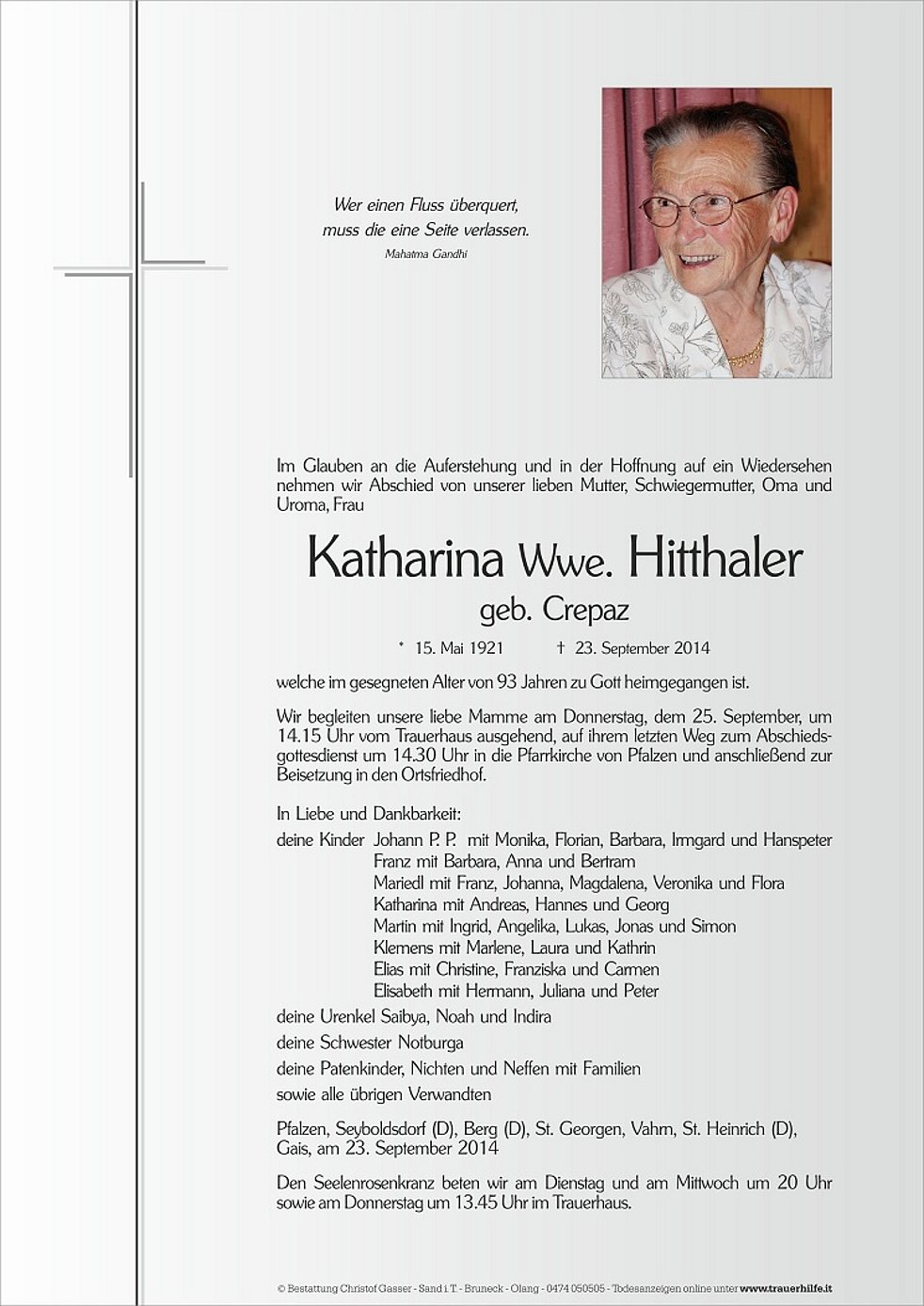 Wir begleiten unsere liebe Mamme am Donnerstag, dem 25. September, um 14.15 Uhr vom Trauerhaus ausgehend, auf ihrem letzten Weg zum Abschieds-gottesdienst um 14.30 Uhr in die Pfarrkirche von Pfalzen und anschließend zur Beisetzung in den Ortsfriedhof.