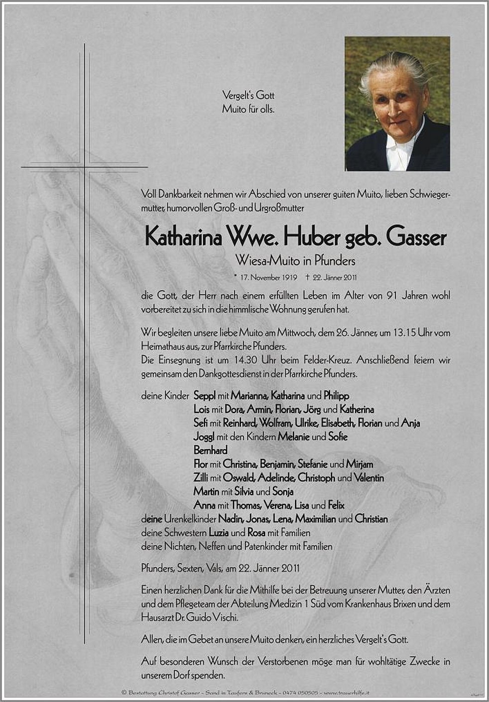 Einen herzlichen Dank für die Mithilfe bei der Betreuung unserer Mutter, den Ärzten und dem Pflegeteam der Abteilung Medizin 1 Süd vom Krankenhaus Brixen und dem Hausarzt Dr. Guido Vischi.