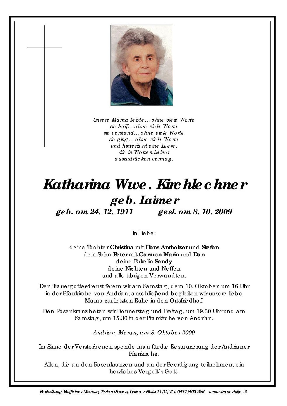 Den Trauergottesdienst feiern wir am Samstag, dem 10. Oktober, um 16 Uhr in der Pfarrkirche von Andrian; anschlieβend begleiten wir unsere liebe Mama zur letzten Ruhe in den Ortsfriedhof.