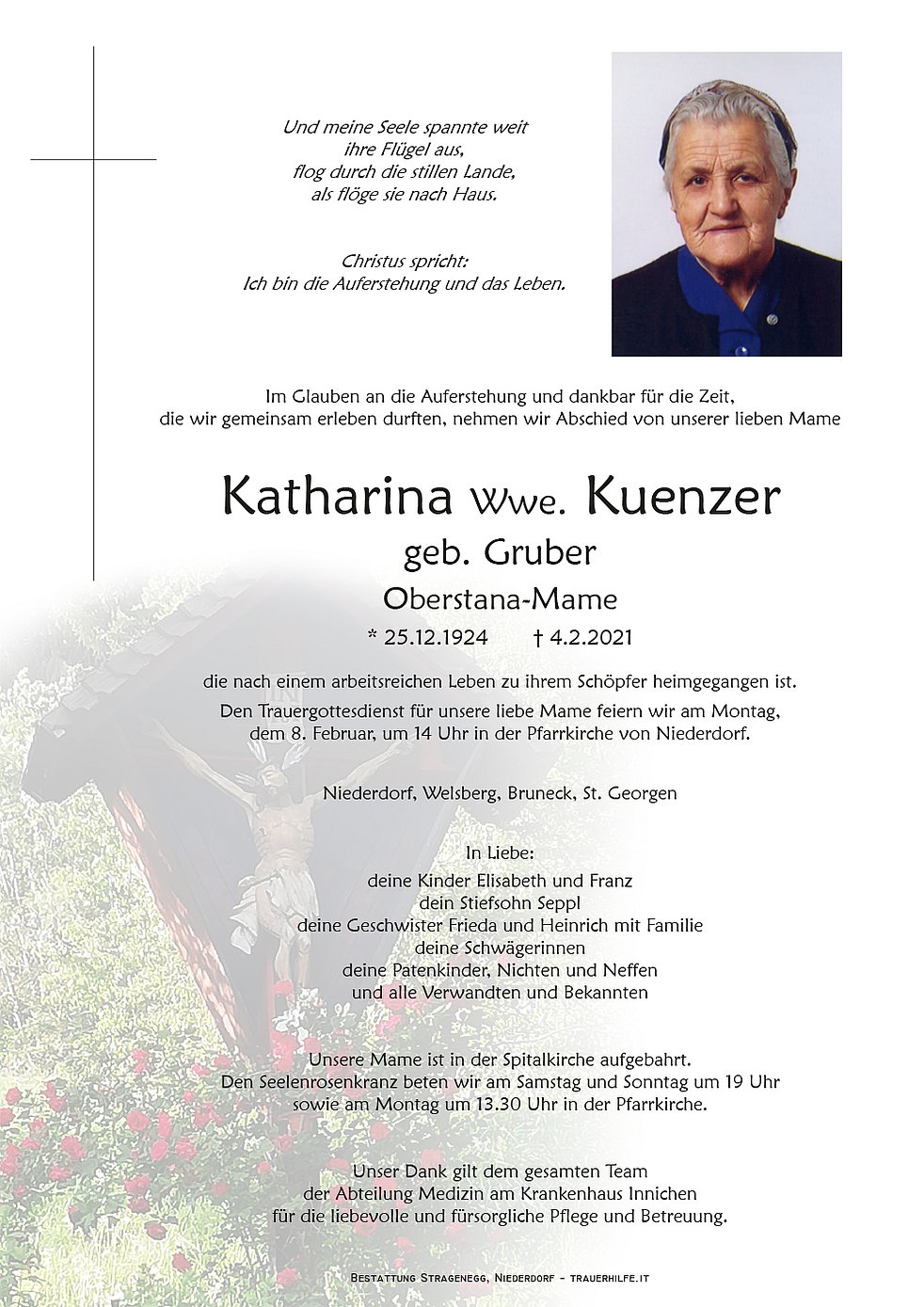 Den Trauergottesdienst für unsere liebe Mame feiern wir am Montag, dem 8. Februar, um 14 Uhr in der Pfarrkirche von Niederdorf.
