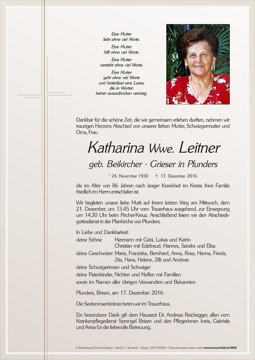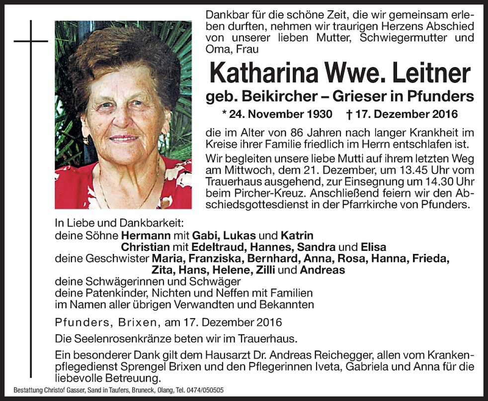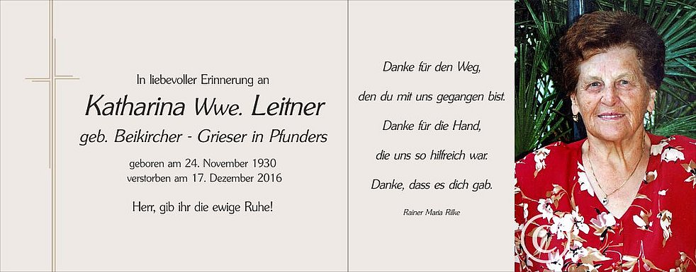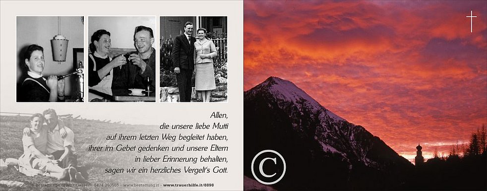 Wir begleiten unsere liebe Mutti auf ihrem letzten Weg am Mittwoch, dem 21. Dezember, um 13.45 Uhr vom Trauerhaus ausgehend, zur Einsegnung um 14.30 Uhr beim Pircher-Kreuz. Anschließend feiern wir den Abschiedsgottesdienst in der Pfarrkirche von Pfunders.