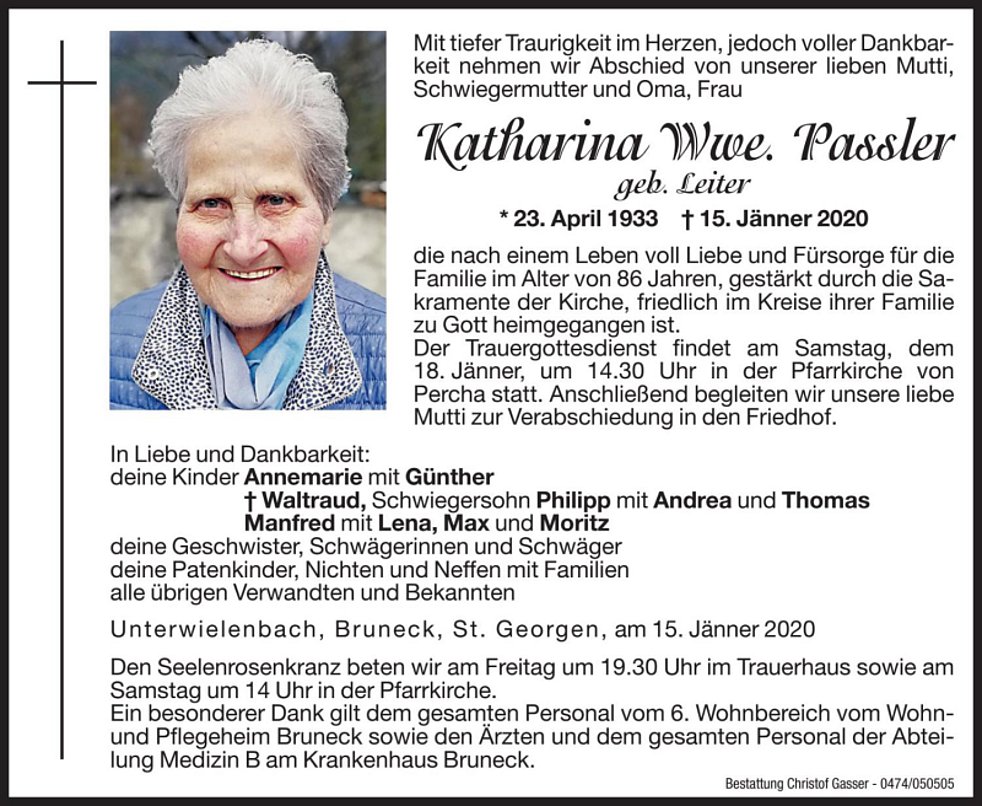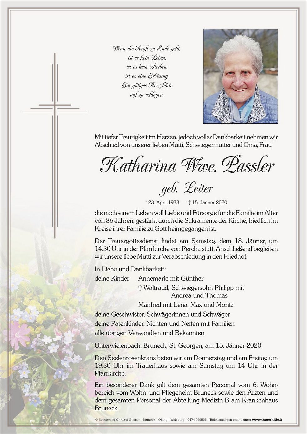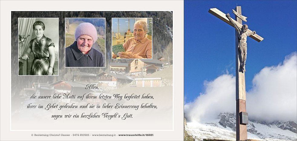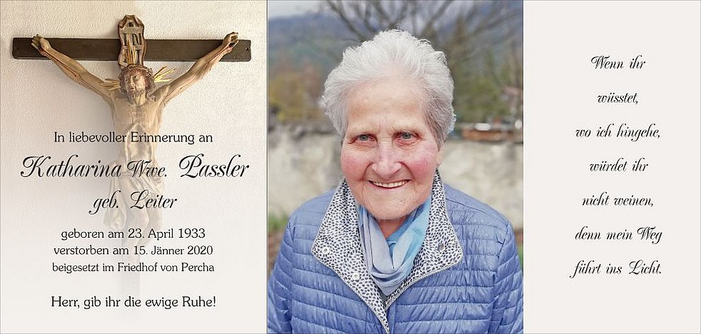 Der Trauergottesdienst findet am Samstag, dem 18. Jänner, um 14.30 Uhr in der Pfarrkirche von Percha statt. Anschließend begleiten wir unsere liebe Mutti zur Verabschiedung in den Friedhof.
