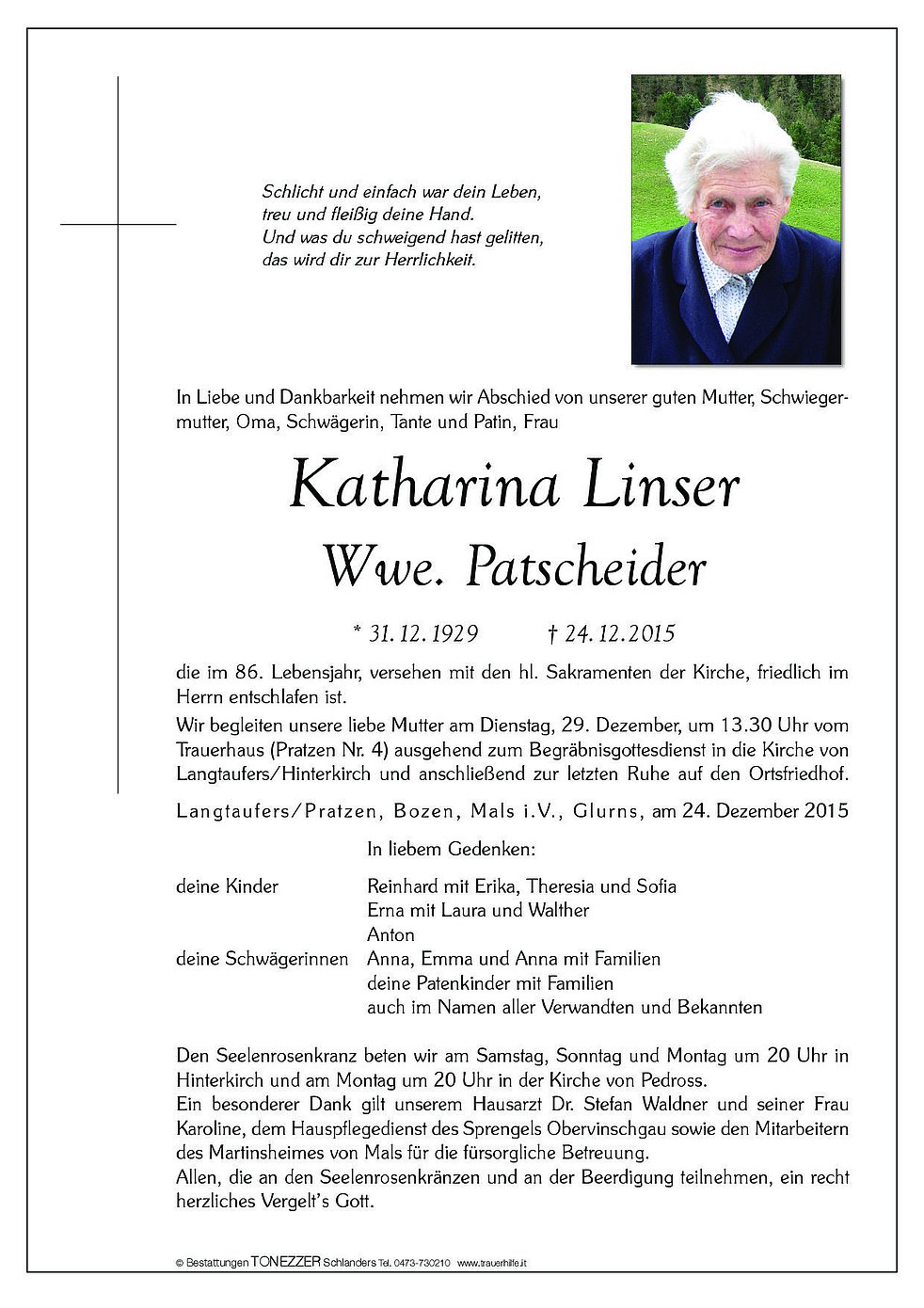 Wir begleiten unsere liebe Mutter am Dienstag, 29. Dezember, um 13.30 Uhr vom Trauerhaus (Pratzen Nr. 4) ausgehend zum Begräbnisgottesdienst in die Kirche von Langtaufers Hinterkirch und anschließend zur letzten Ruhe auf den Ortsfriedhof.