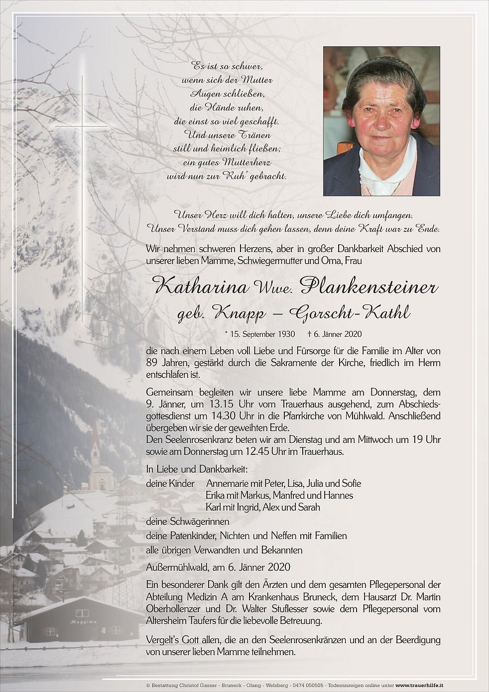 Gemeinsam begleiten wir unsere liebe Mamme am Donnerstag, dem 9. Jänner, um 13.15 Uhr vom Trauerhaus ausgehend, zum Abschiedsgottesdienst um 14.30 Uhr in die Pfarrkirche von Mühlwald. Anschließend übergeben wir sie der geweihten Erde.