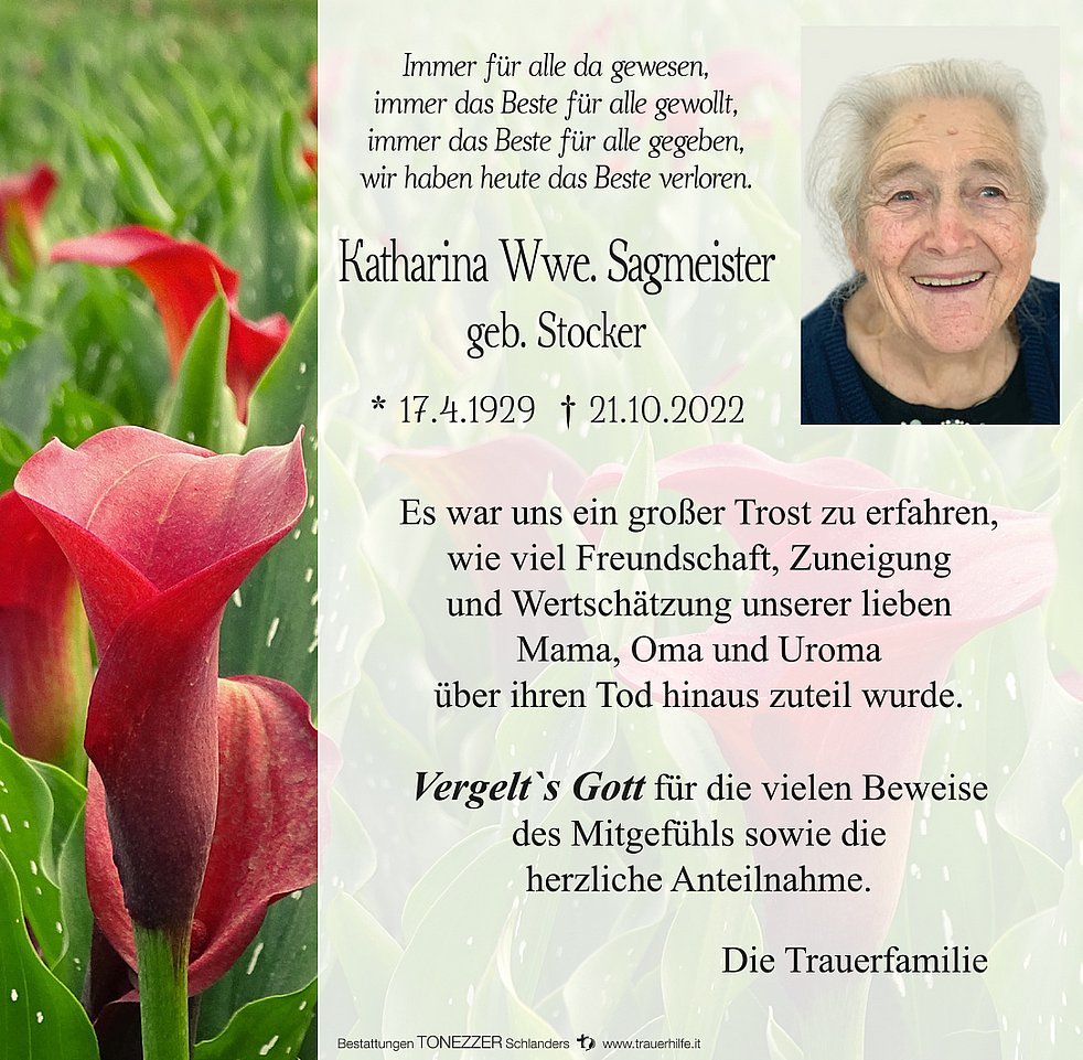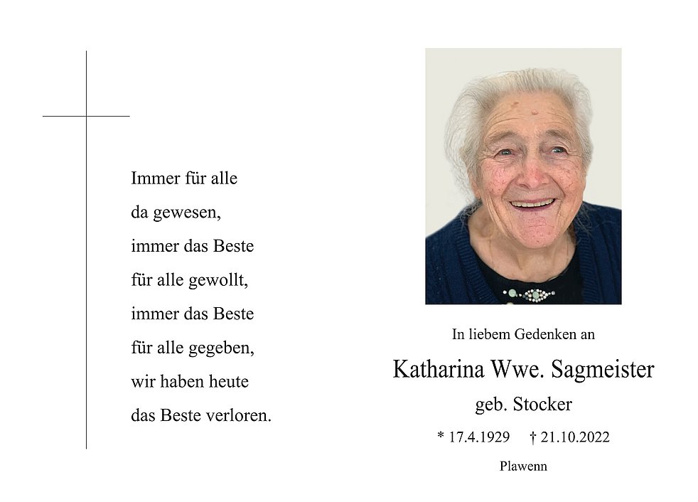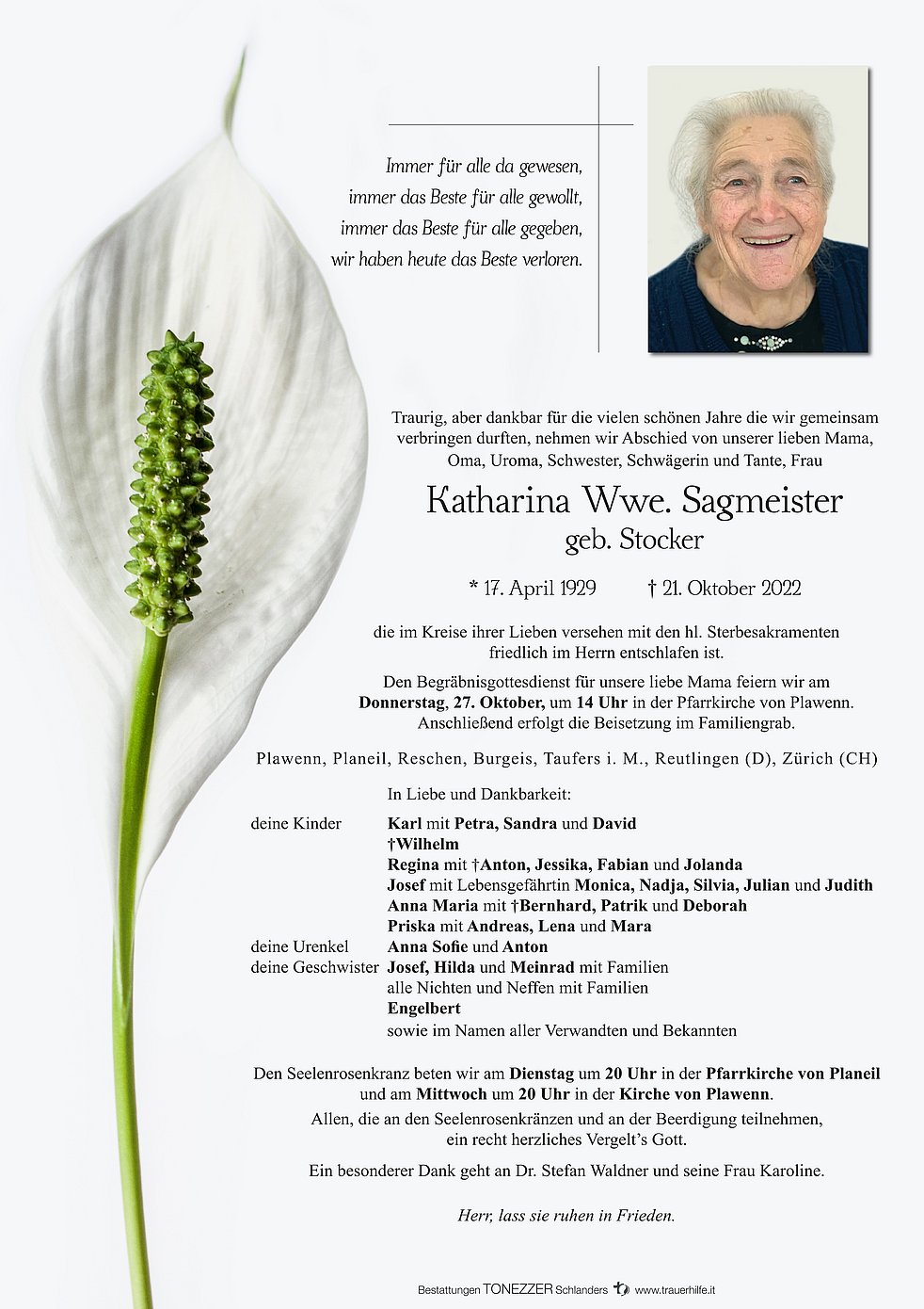 Den Begräbnisgottesdienst für unsere liebe Mama feiern wir am Donnerstag, 27. Oktober, um 14 Uhr in der Pfarrkirche von Plawenn.
