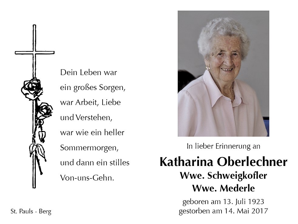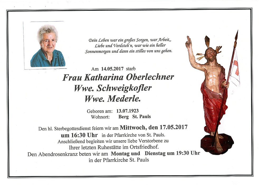 Den Trauergottesdienst feiern wir am Mittwoch, dem 17. Mai um 16.30 Uhr in der Pfarrkirche von St. Pauls. Anschließend begleiten wir unsere liebe Verstorbene auf den Ortsfriedhof.