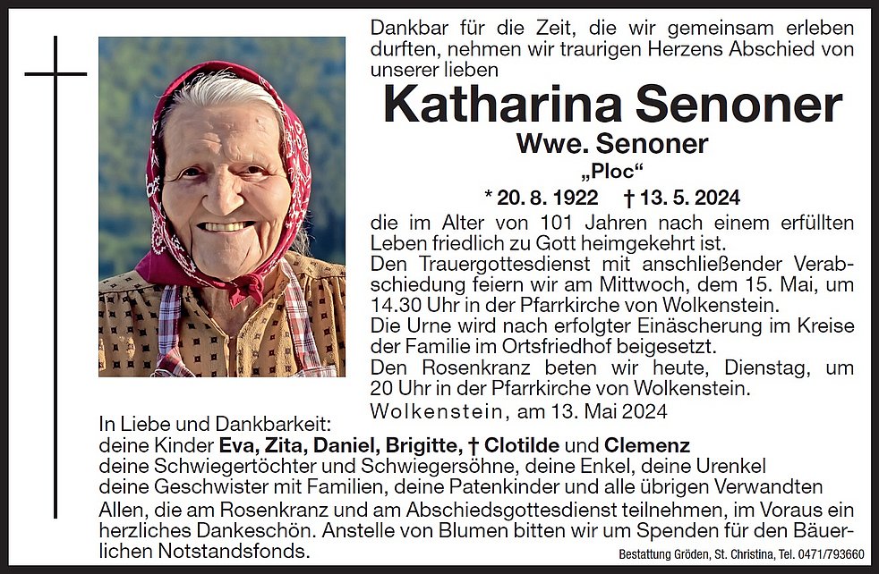 Den Trauergottesdienst mit anschließender Verabschiedung feiern wir am Mittwoch, dem 15. Mai, um 14.30 Uhr in der Pfarrkirche von Wolkenstein.