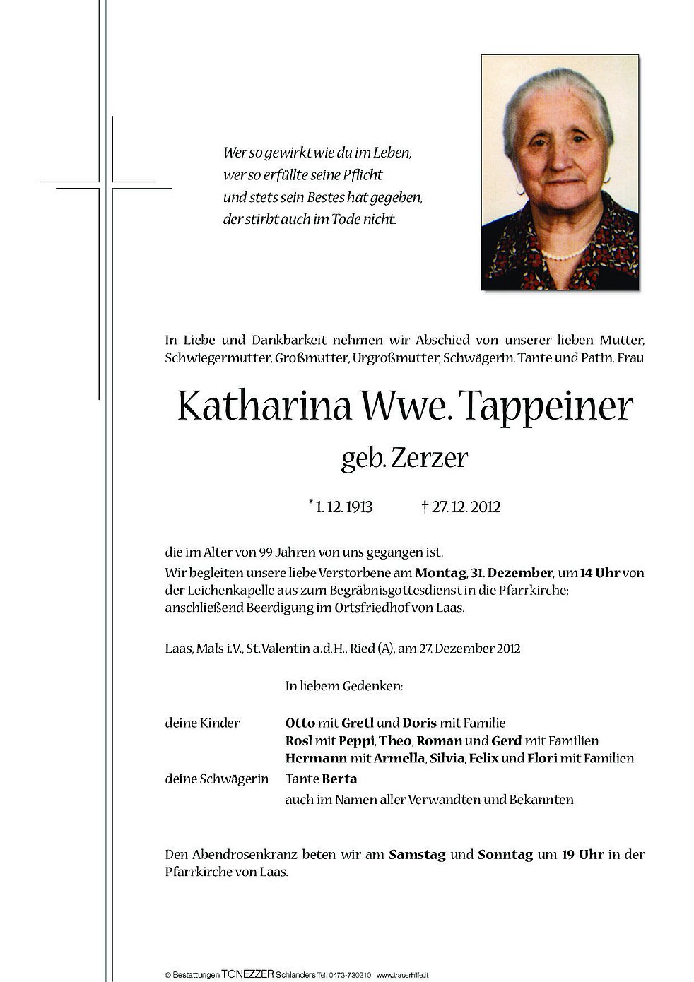 Wir begleiten unsere liebe Verstorbene am Montag, 31. Dezember, um 14 Uhr von der Leichenkapelle aus zum Begräbnisgottesdienst in die Pfarrkirche;