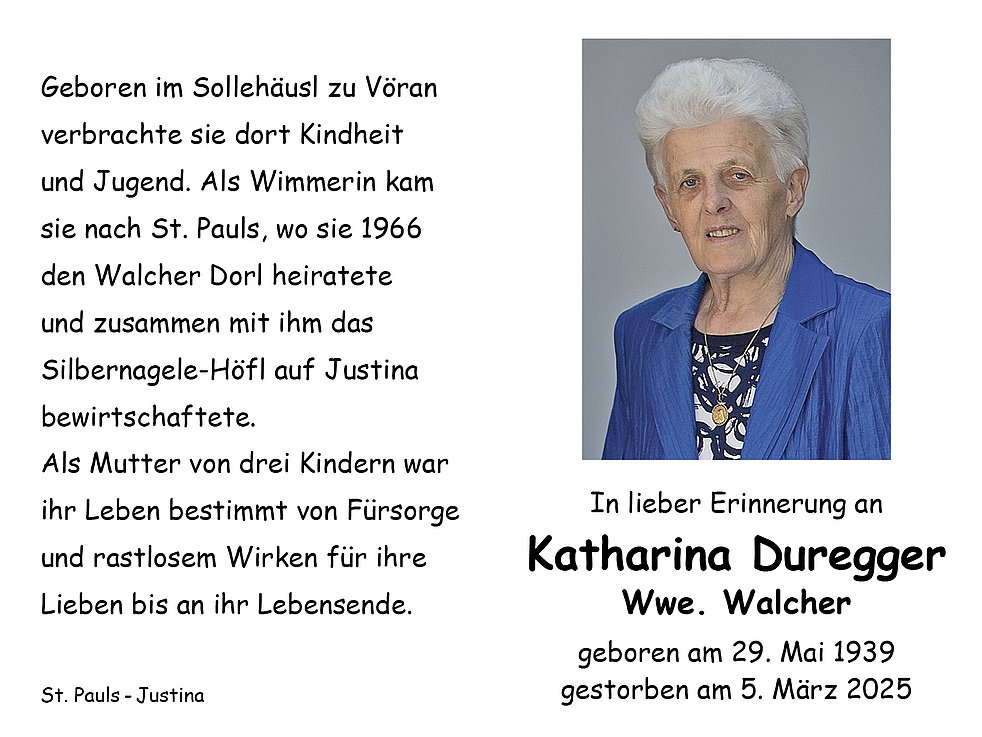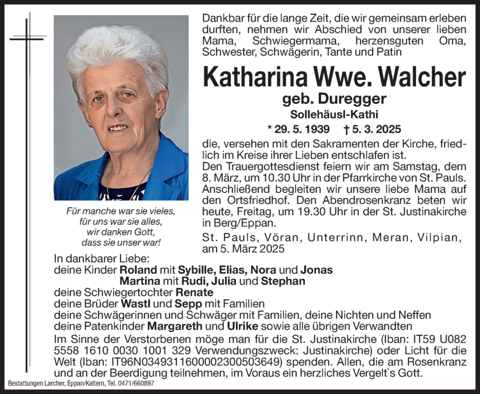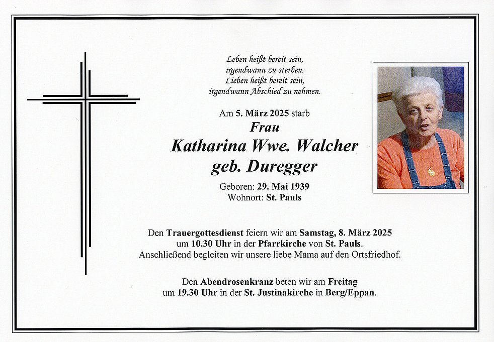 Den Trauergottesdienst feiern wir am Samstag, dem 8. März, um 10.30 Uhr in der Pfarrkirche von St. Pauls. Anschließend begleiten wir unsere liebe Mama auf den Ortsfriedhof.