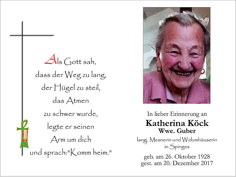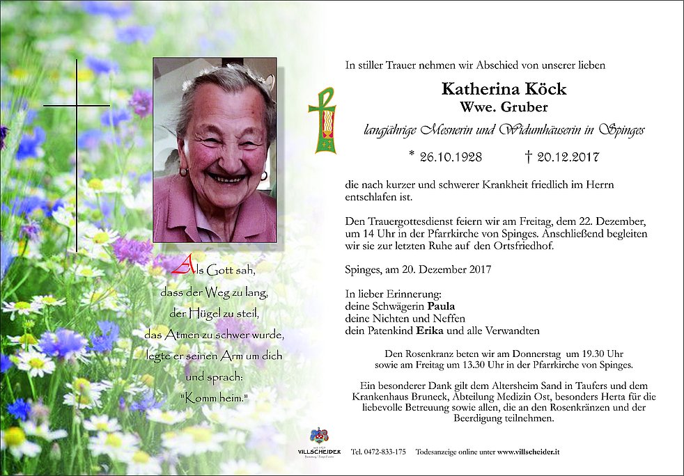 Ein besonderer Dank gilt dem Altersheim Sand in Taufers und dem Krankenhaus Bruneck, Abteilung Medizin Ost, besonders Herta für die liebevolle Betreuung sowie allen, die an den Rosenkränzen und der Beerdigung teilnehmen.