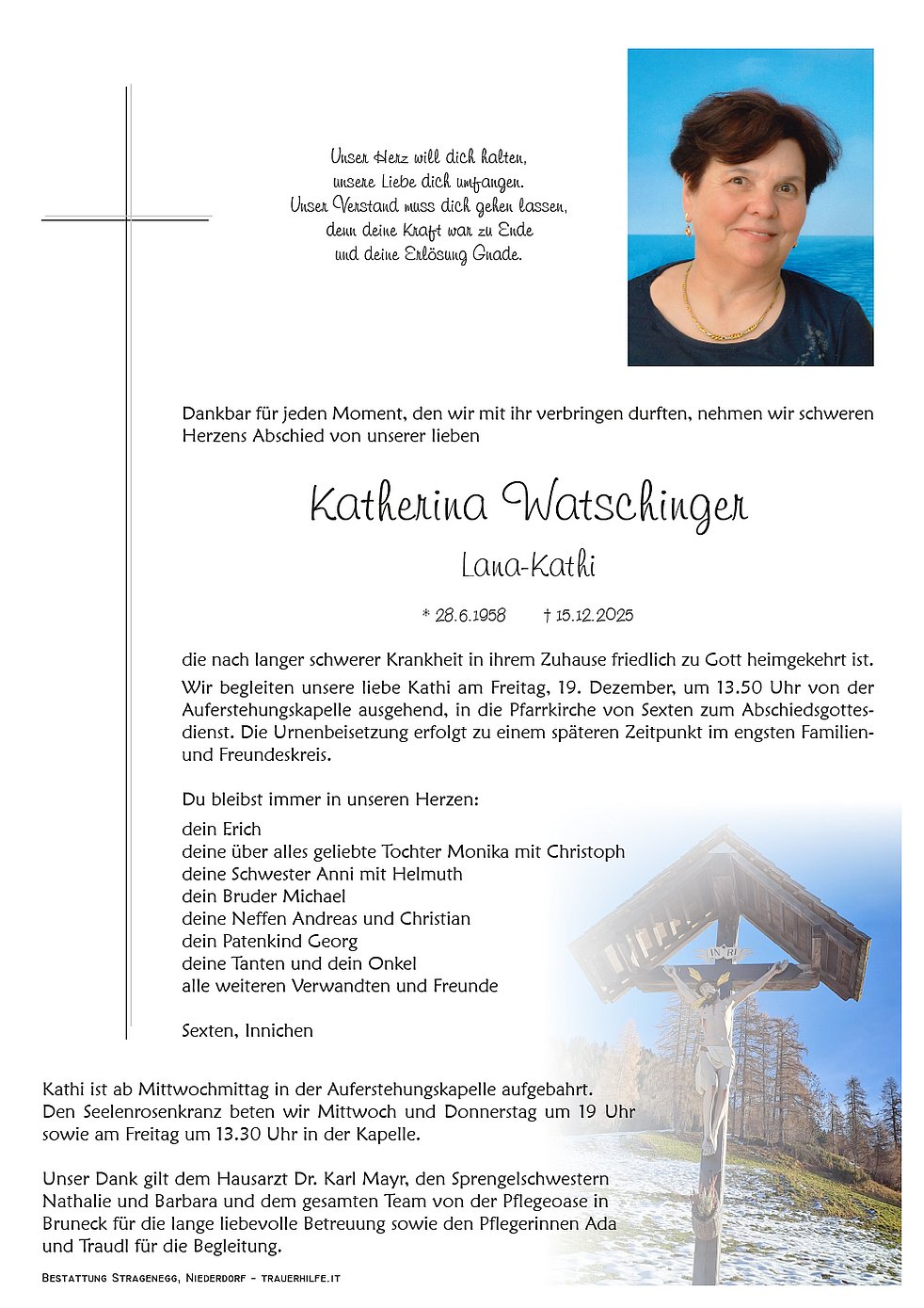Kathy Du hast Dich immer erkundigt, wie es mir geht und hast Dich besorgt um mein Wohlergehen gezeigt. Einmal hast Du genau das befürchtet, was Dir dann bei Deiner Arbeit auf dem Hof passiert ist. Lieber Erich! Wie sehr Du Dich bis zum Schluss um Deine Kathy gekümmert hast, das ist ein lebendiges Beispiel für uns alle. Vielen Dank dafür!