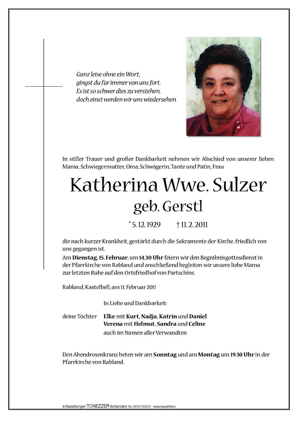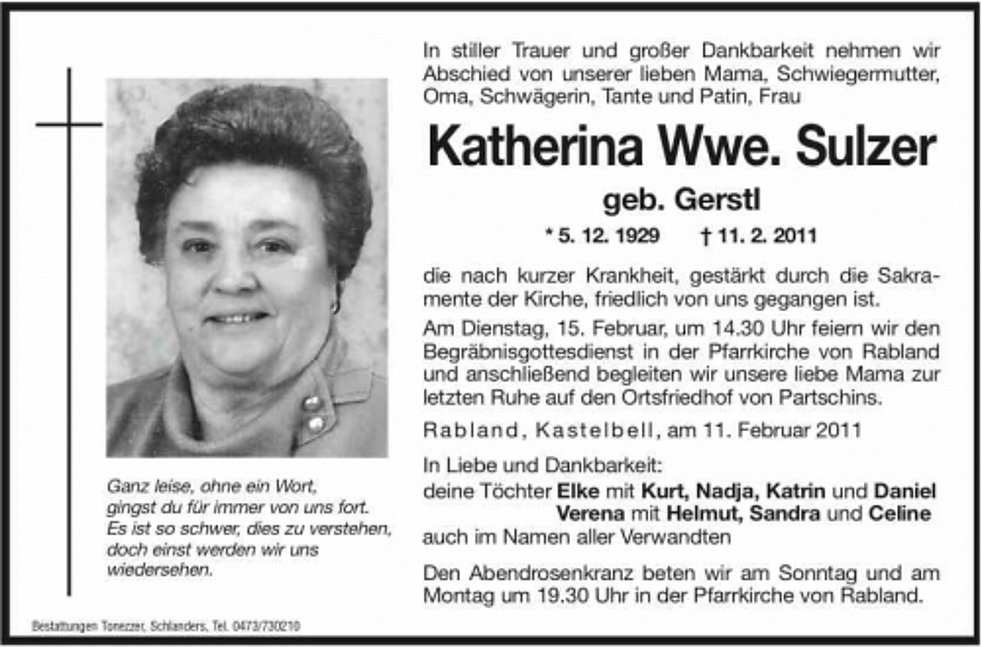 Am Dienstag, 15. Februar, um 14.30 Uhr feiern wir den Begräbnisgottesdienst in der Pfarrkirche von Rabland und anschließend begleiten wir unsere liebe Mama zur letzten Ruhe auf den Ortsfriedhof von Partschins.