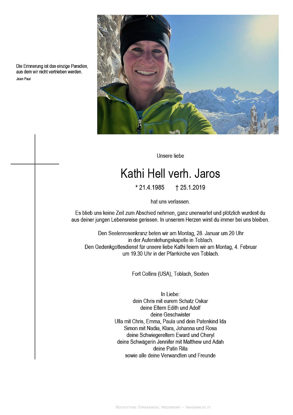 Den Seelenrosenkranz beten wir am Montag, 28. Januar um 20 Uhr in der Auferstehungskapelle in Toblach. Den Gedenkgottesdienst für unsere liebe Kathi feiern wir am Montag, 4. Februar um 19.30 Uhr in der Pfarrkirche von Toblach.