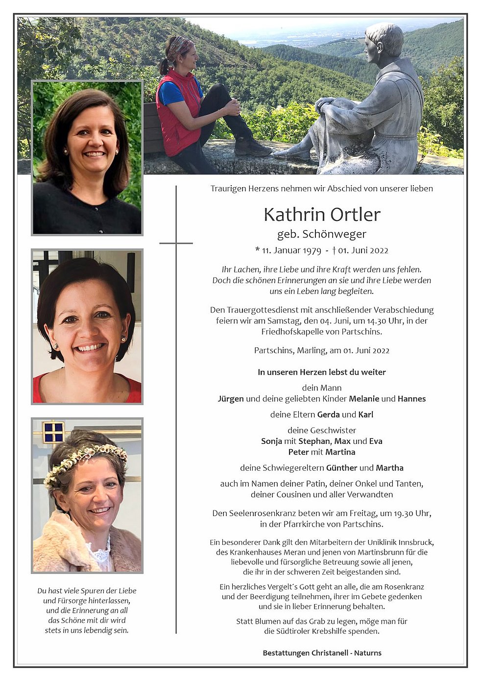 Ein besonderer Dank gilt den Mitarbeitern der Uniklinik Innsbruck, des Krankenhauses Meran und jenen von Martinsbrunn für die liebevolle und fürsorgliche Betreuung sowie all jenen, die ihr in der schweren Zeit beigestanden sind.