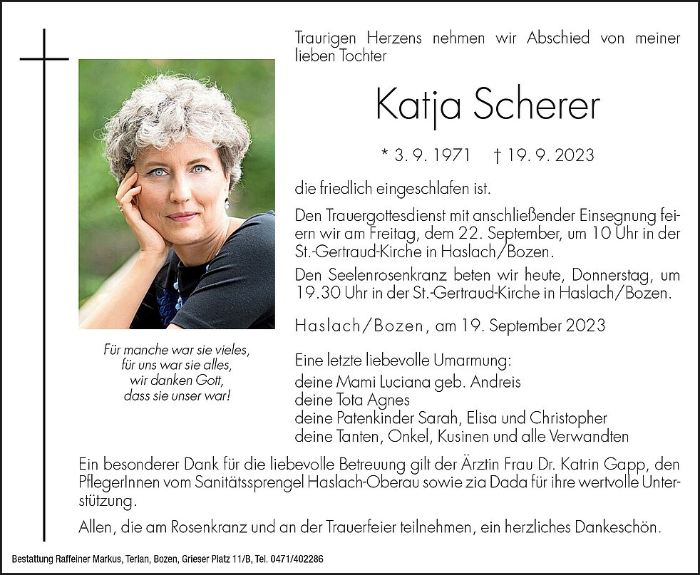 Den Trauergottesdienst mit anschließender Einsegnung feiern wir am Freitag, dem 22. September, um 10 Uhr in der St. Gertraud-Kirche in Haslach/Bozen.