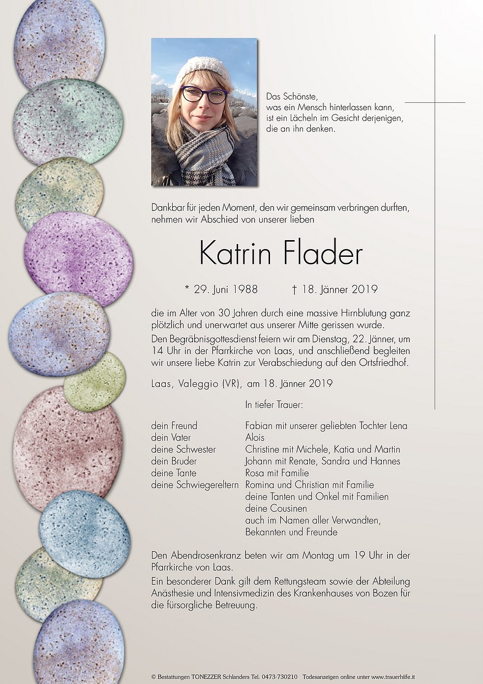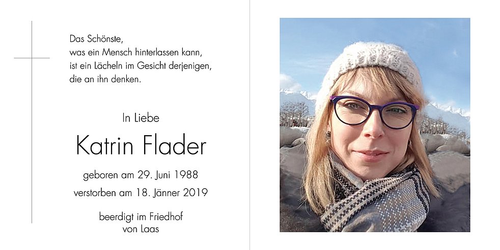 Den Begräbnisgottesdienst feiern wir am Dienstag, 22. Jänner, um 14 Uhr in der Pfarrkirche von Laas, und anschließend begleiten wir unsere liebe Katrin zur Verabschiedung auf den Ortsfriedhof.