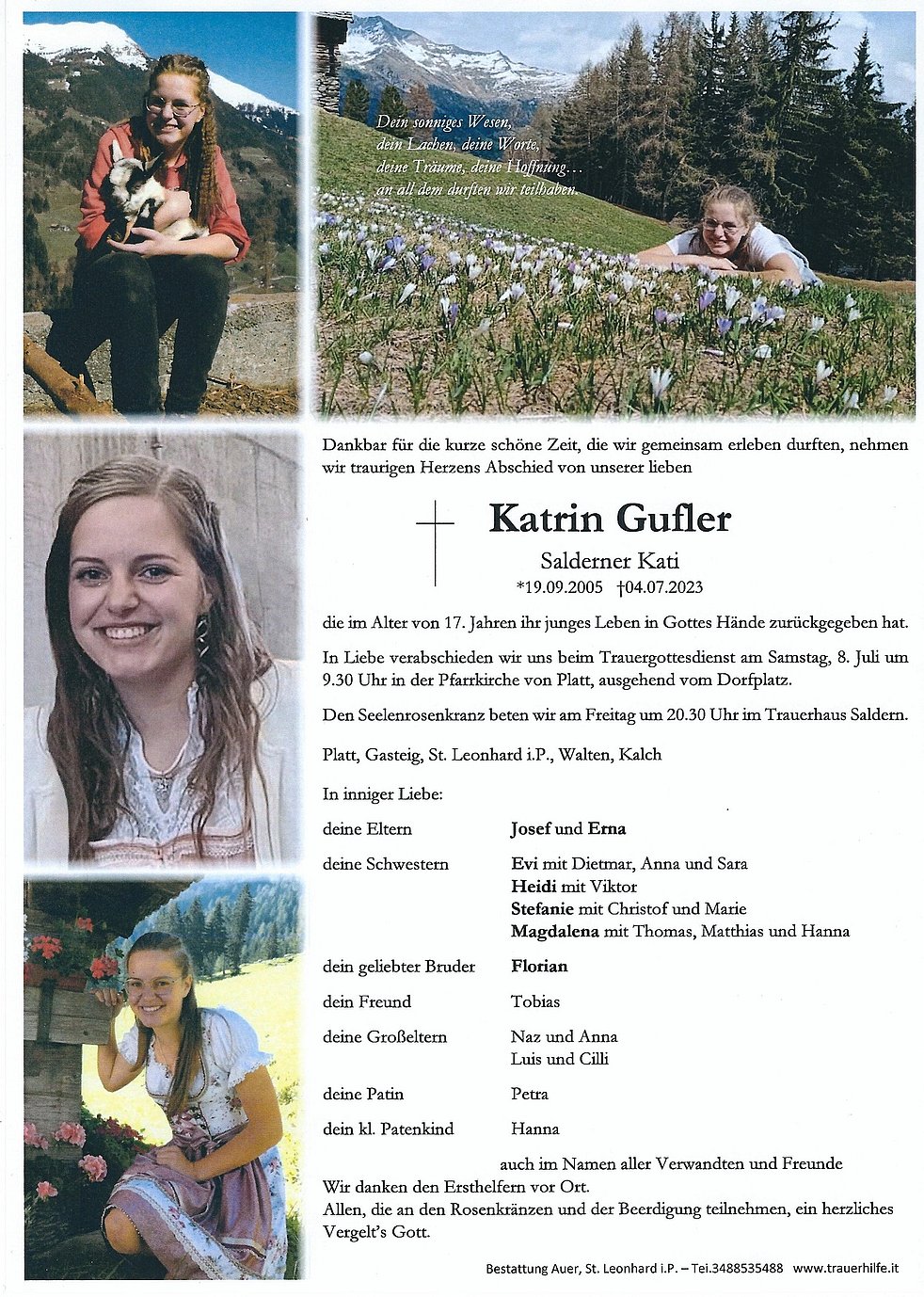 In Liebe verabschieden wir uns beim Trauergottesdienst am Samstag, 8. Juli um 9.30 Uhr in der Pfarrkirche von Platt, ausgehend vom Dorfplatz.