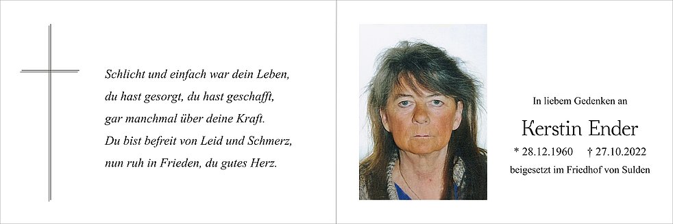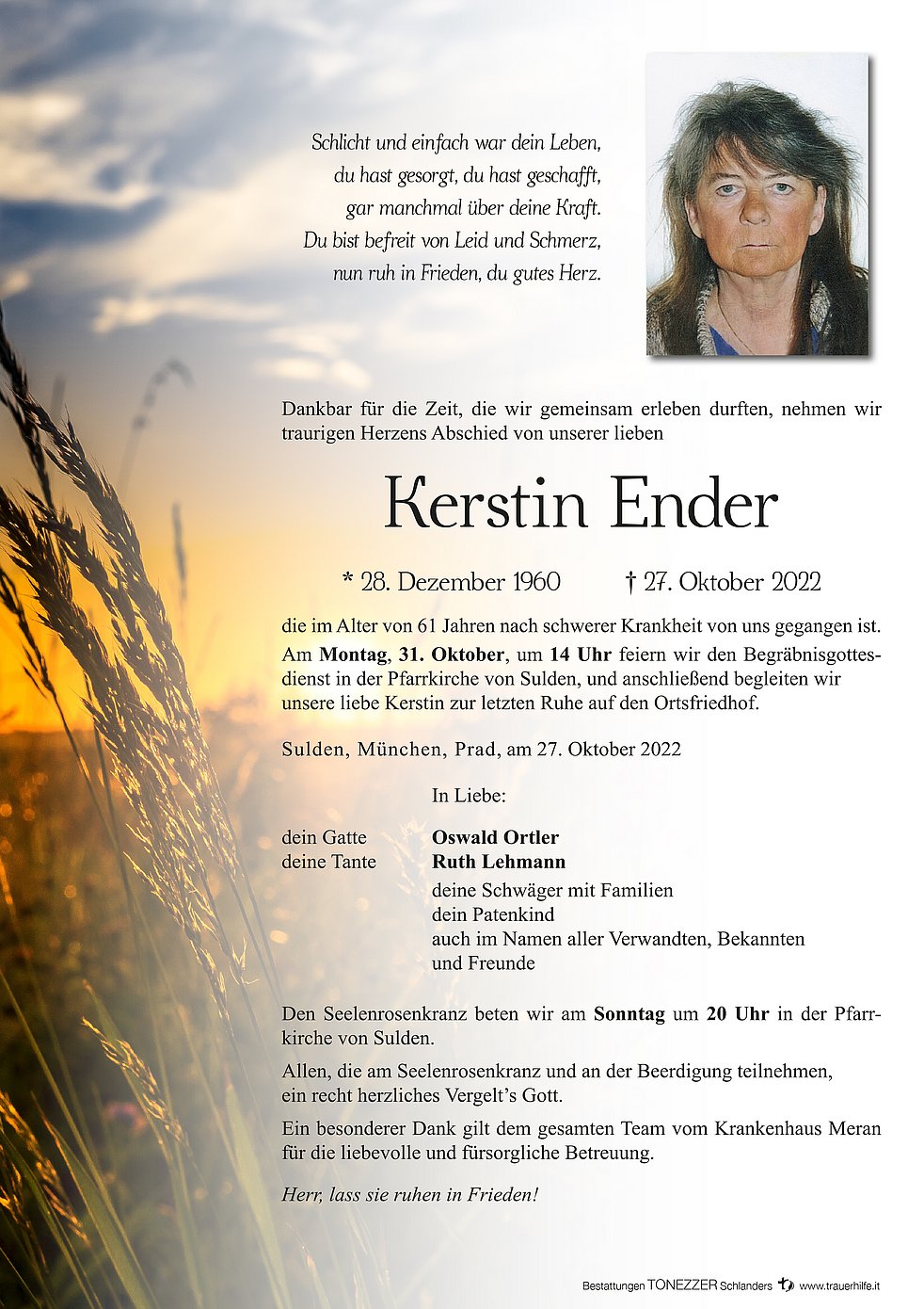 Am Montag, 31. Oktober, um 14 Uhr feiern wir den Begräbnisgottesdienst in der Pfarrkirche von Sulden, und anschließend begleiten wir unsere liebe Kerstin zur letzten Ruhe auf den Ortsfriedhof.