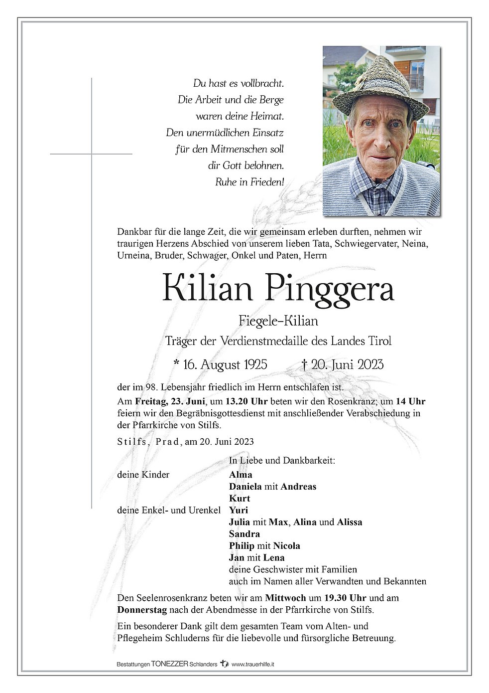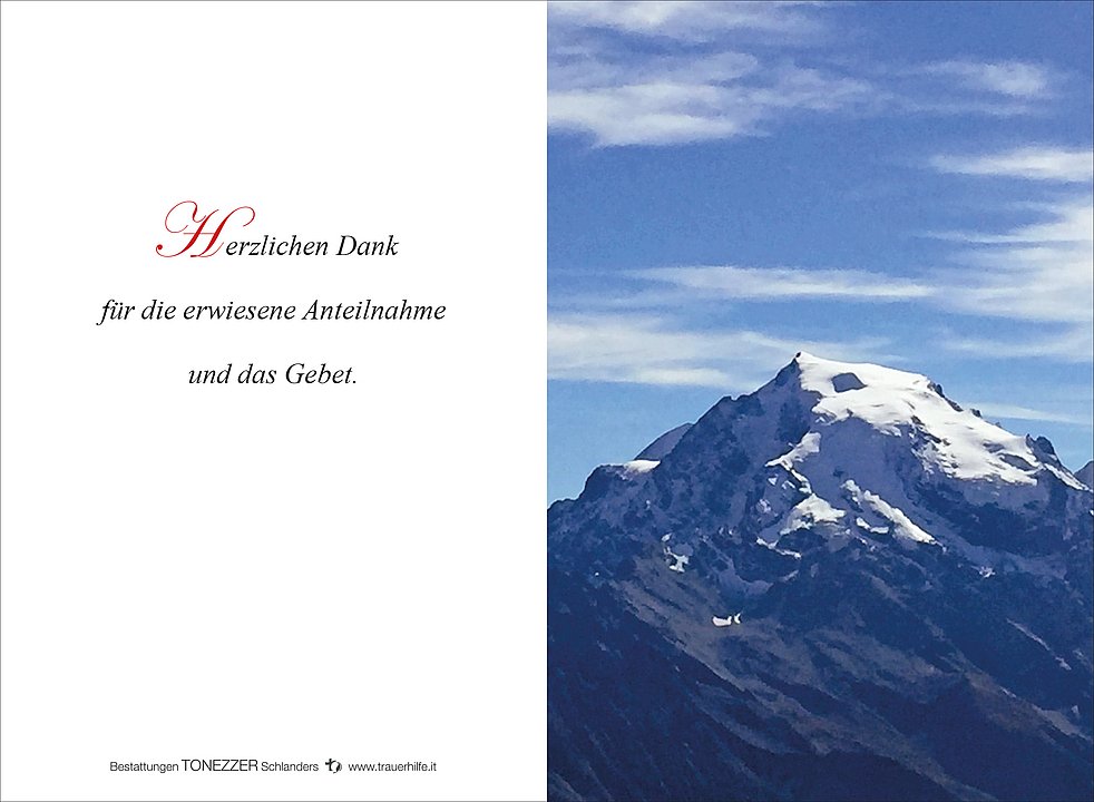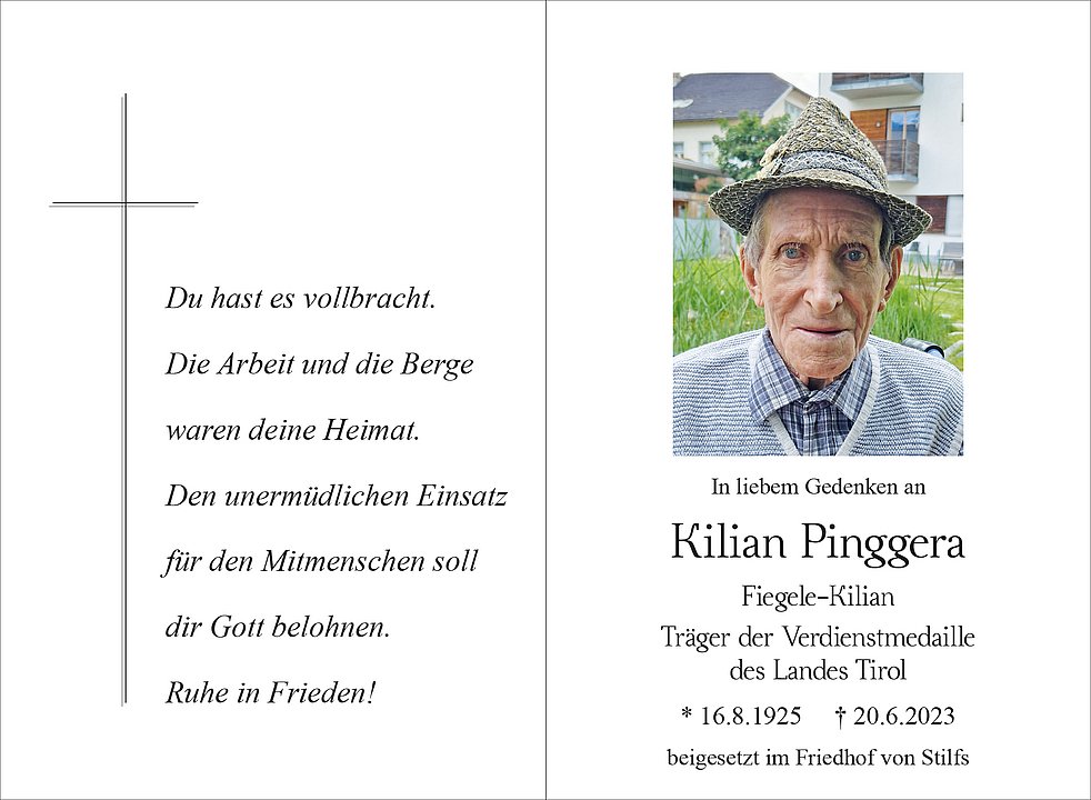 Am Freitag, 23. Juni, um 13.20 Uhr beten wir den Rosenkranz; um 14 Uhr feiern wir den Begräbnisgottesdienst mit anschließender Verabschiedung in der Pfarrkirche von Stilfs.
