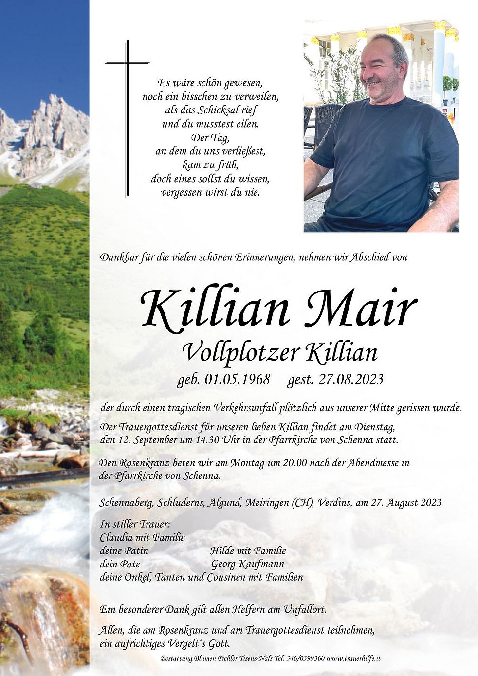 Begräbnisgottesdienst: 12.09. - 14:30 Uhr Pfarrkirche Schenna