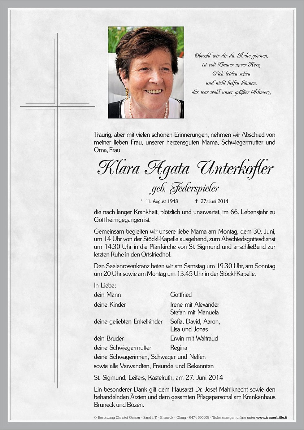 Gemeinsam begleiten wir unsere liebe Mama am Montag, dem 30. Juni, um 14 Uhr von der Stöckl-Kapelle ausgehend, zum Abschiedsgottesdienst um 14.30 Uhr in die Pfarrkirche von St. Sigmund und anschließend zur letzten Ruhe in den Ortsfriedhof.
