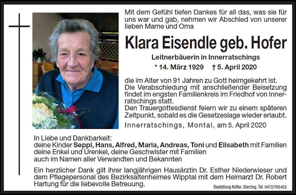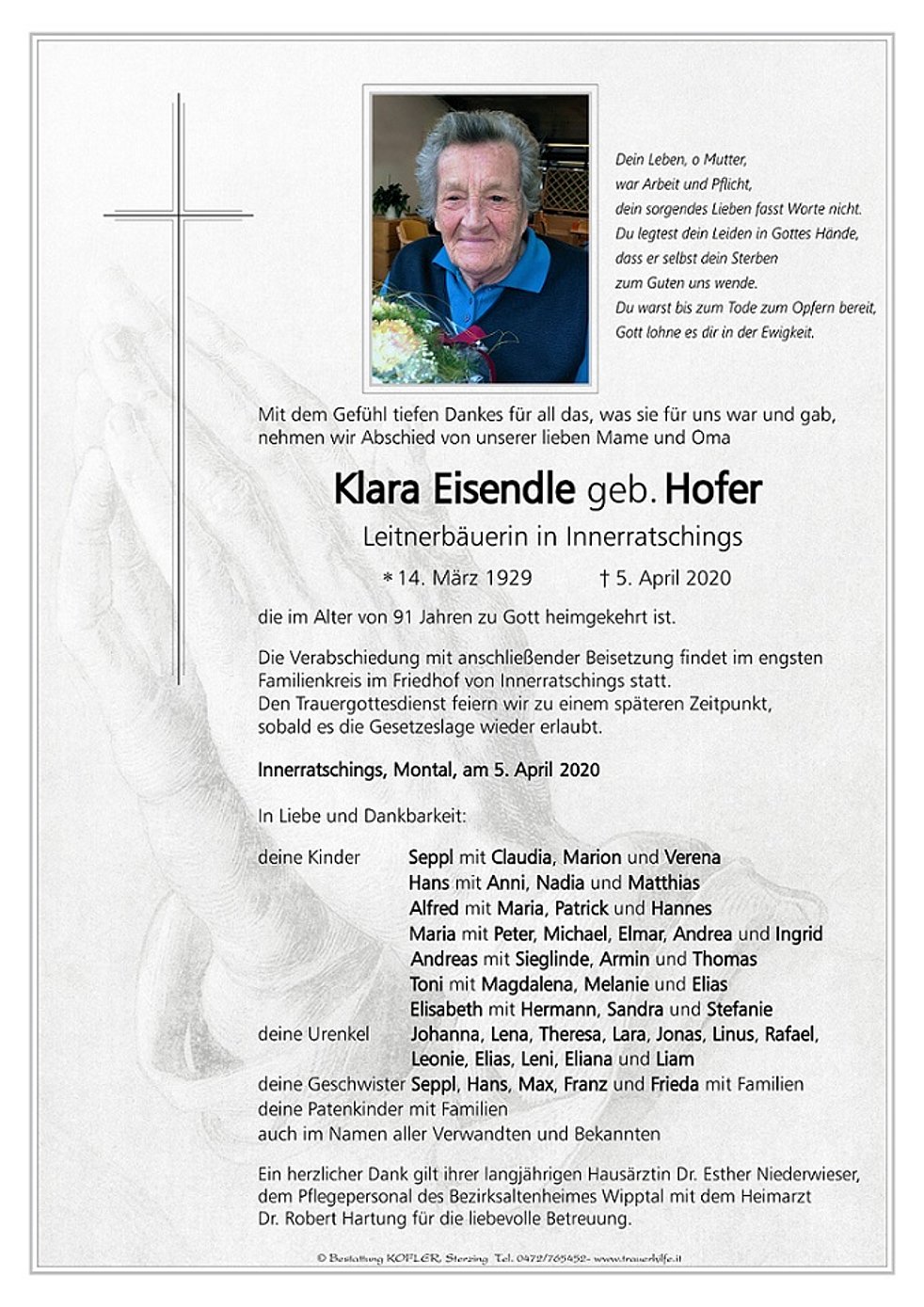 Die Verabschiedung mit anschließender Beisetzung findet im engsten Familienkreis im Friedhof von Innerratschings statt.