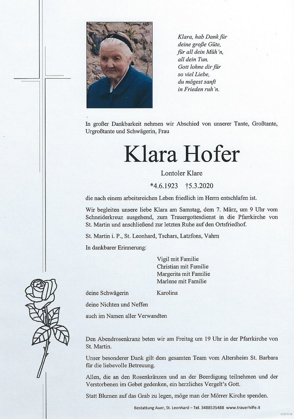 Wir begleiten unsere liebe Klara am Samstag, dem 7. März, um 9 Uhr vom Schneiderkreuz ausgehend, zum Trauergottesdienst in die Pfarrkirche von St. Martin und anschließend zur letzten Ruhe auf den Ortsfriedhof.