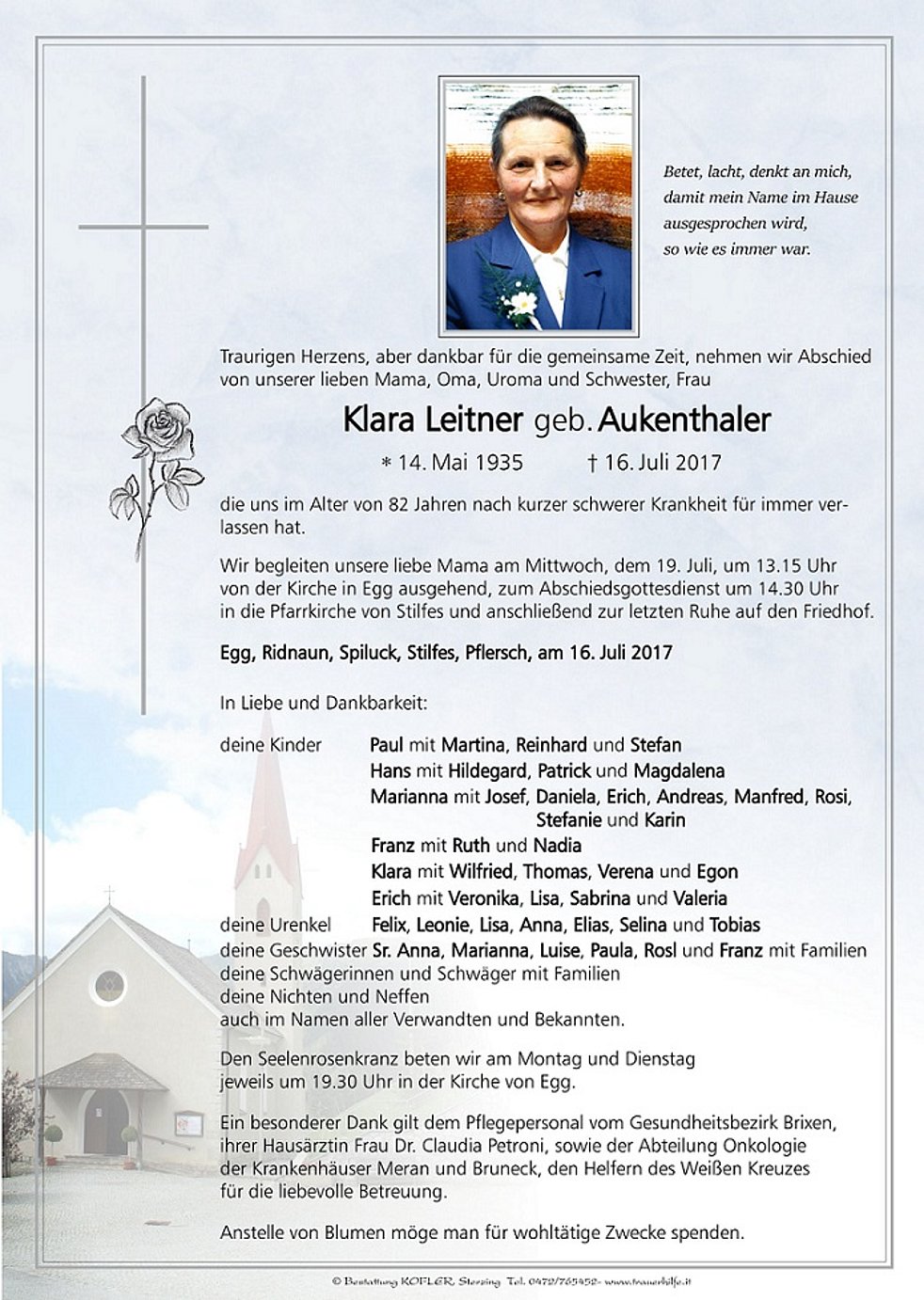 Wir begleiten unsere liebe Mama am Mittwoch, dem 19. Juli, um 13.15 Uhr von der Kirche in Egg ausgehend, zum Abschiedsgottesdienst um 14.30 Uhr in die Pfarrkirche von Stilfes und anschließend zur letzten Ruhe auf den Friedhof.