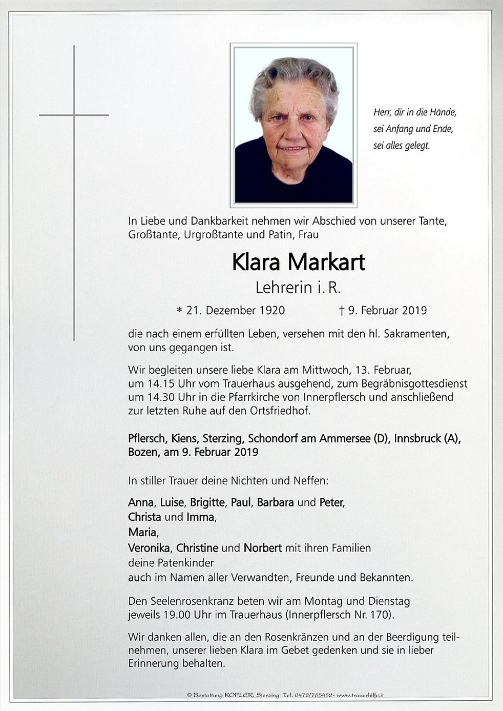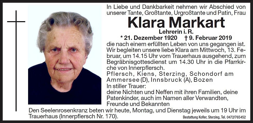 Wir begleiten unsere liebe Klara am Mittwoch, 13. Februar, um 14.15 Uhr vom Trauerhaus ausgehend, zum Begräbnisgottesdienst um 14.30 Uhr in die Pfarrkirche von Innerpflersch und anschließend zur letzten Ruhe auf den Ortsfriedhof.