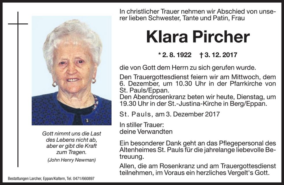 Den Trauergottesdienst feiern wir am Mittwoch, dem 6. Dezember um 10.30 Uhr in der Pfarrkirche von St. Pauls/Eppan.