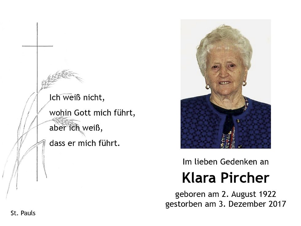 Ein besonderer Dank geht an das Pflegepersonal des Altenheimes St. Pauls für die jahrelange, liebevolle Betreuung.