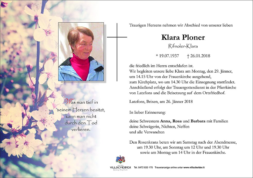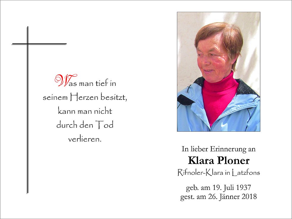 zum Kirchplatz, wo um 14.30 Uhr die Einsegnung stattfindet. Anschließend erfolgt der Trauergottesdienst in der Pfarrkirche von Latzfons und die Beisetzung auf dem Ortsfriedhof.