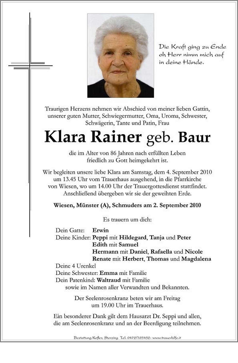 Wir begleiten unsere liebe Klara am Samstag, dem 4. September 2010 um 13.45 Uhr vom Trauerhaus ausgehend, in die Pfarrkirche von Wiesen, wo um 14.00 Uhr der Trauergottesdienst stattfindet. Anschließend übergeben wir sie der geweihten Erde.