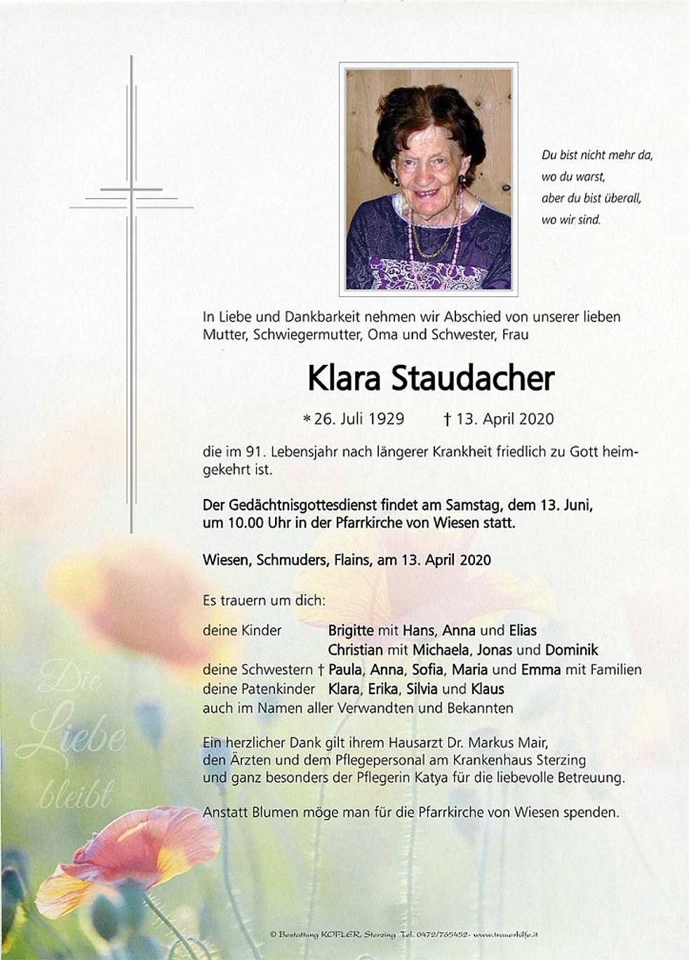Ein herzlicher Dank gilt ihrem Hausarzt Dr. Markus Mair, den Ärzten und dem Pflegepersonal am Krankenhaus Sterzing und ganz besonders der Pflegerin Katya für die liebevolle Betreuung.