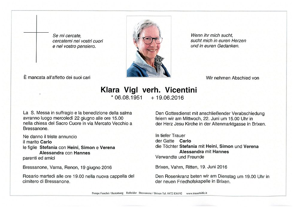 Ein besonderer Dank gilt dem gesamten Personal des Krankenhauses Brixen für die professionelle und liebevolle Betreuung sowie allen, die an der Verabschiedung teilnehmen.
