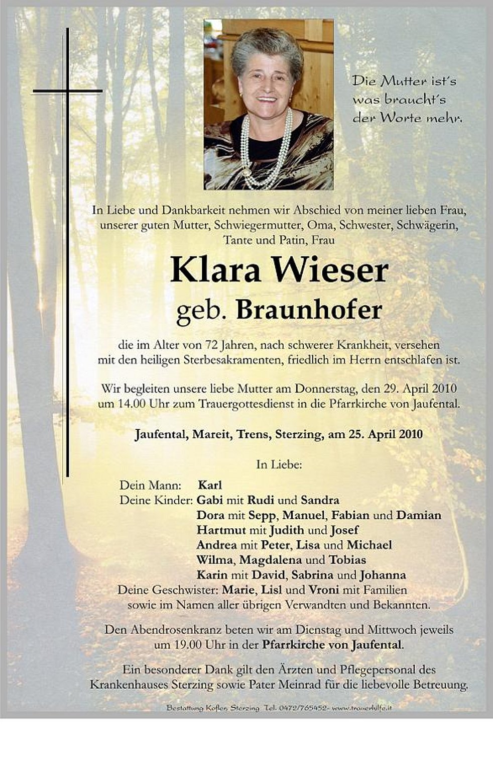 Wir begleiten unsere liebe Mutter am Donnerstag, den 29. April 2010