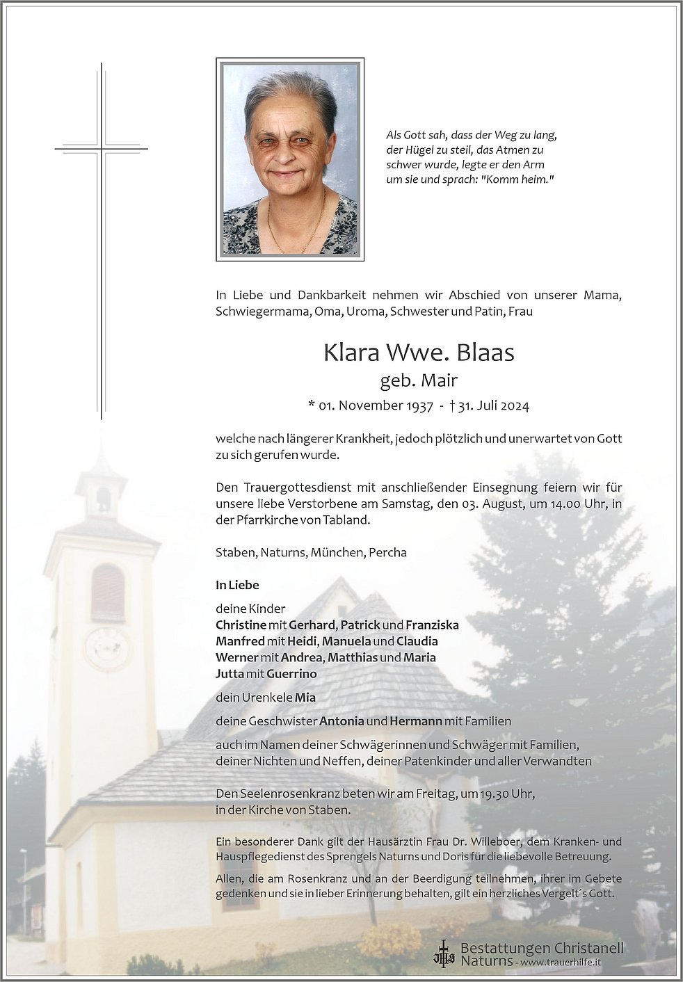 Den Trauergottesdienst mit anschließender Einsegnung feiern wir für unsere liebe Verstorbene am Samstag, den 03. August, um 14.00 Uhr, in der Pfarrkirche von Tabland.