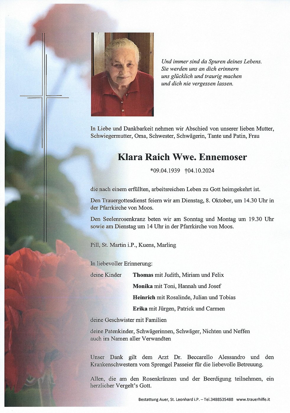 Den Trauergottesdienst feiern wir am Dienstag, 8. Oktober, um 14.30 Uhr in der Pfarrkirche von Moos.