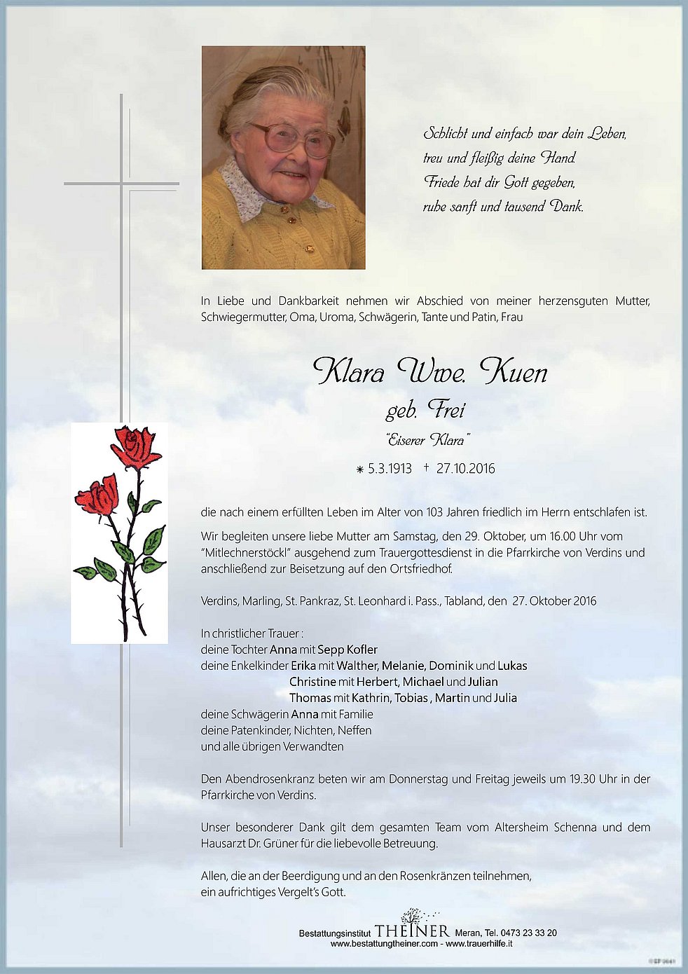 Unser besonderer Dank gilt dem gesamten Team vom Altersheim Schenna und dem Hausarzt Dr. Grüner für die liebevolle Betreuung.