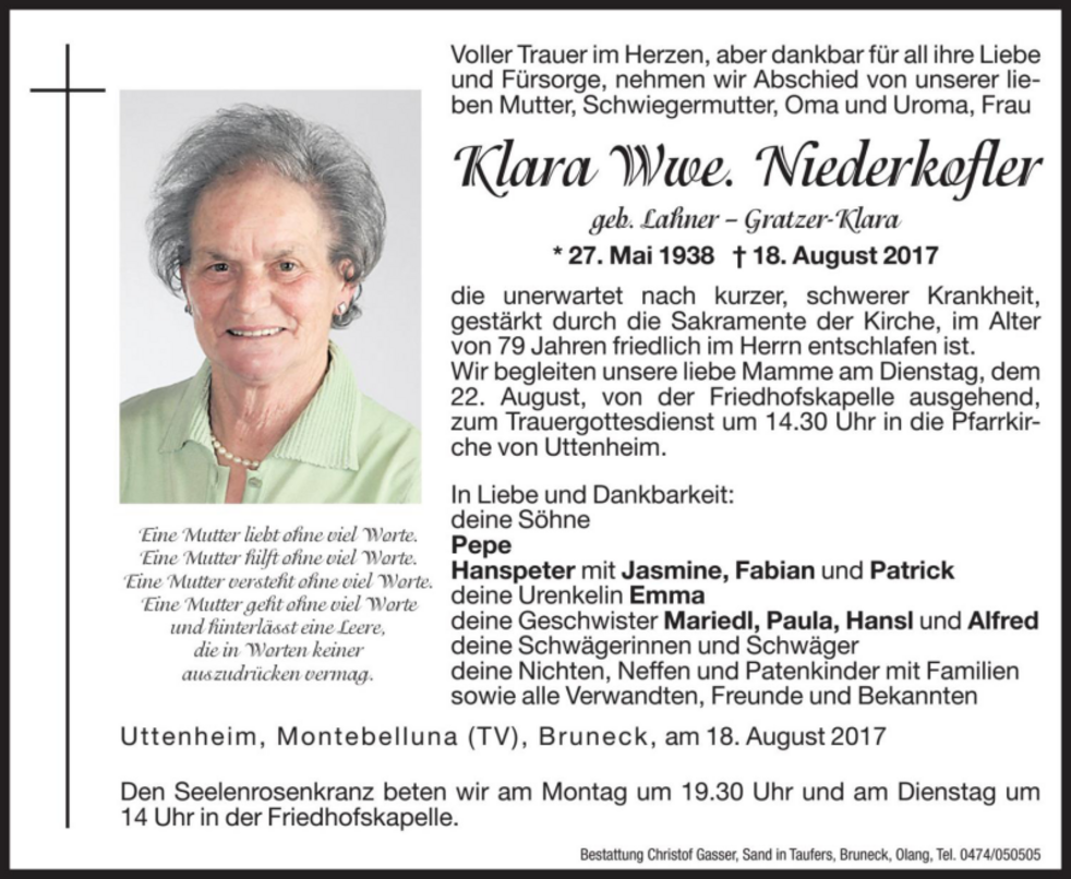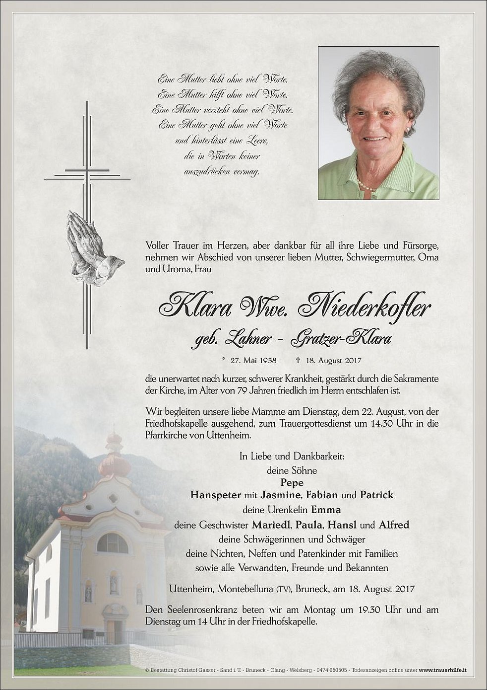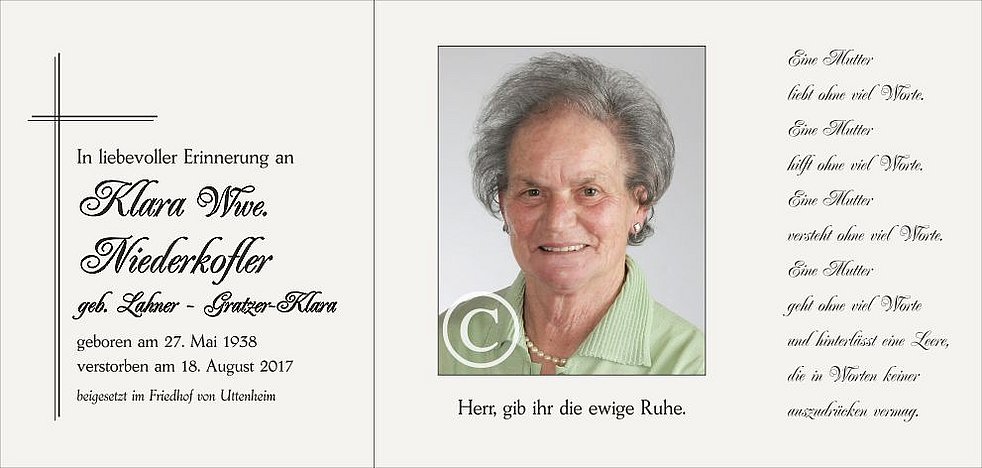 Wir begleiten unsere liebe Mamme am Dienstag, dem 22. August, von der Friedhofskapelle ausgehend, zum Trauergottesdienst um 14.30 Uhr in die Pfarrkirche von Uttenheim.