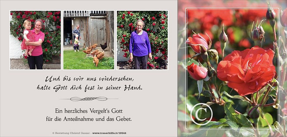 Voller Trauer im Herzen, aber dankbar für all ihre Liebe und Fürsorge, nehmen wir Abschied von unserer lieben Mutter, Schwiegermutter, Oma und Uroma, Frau