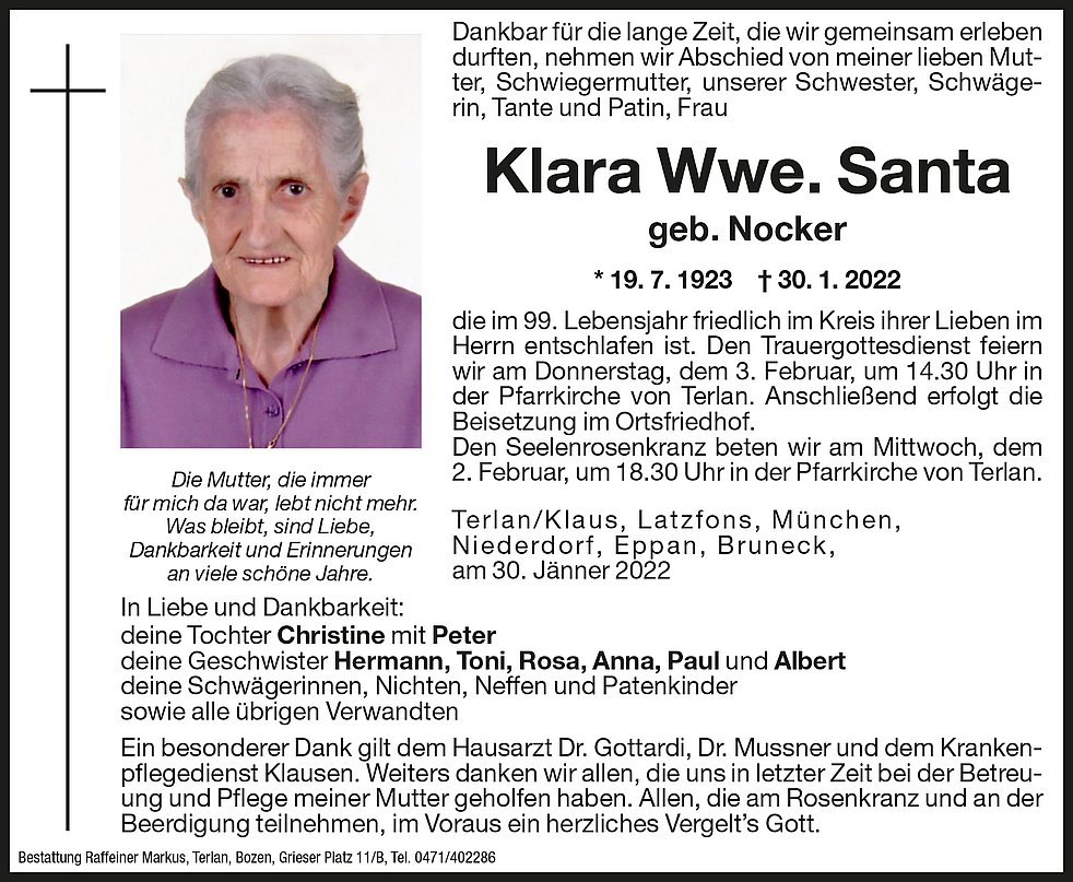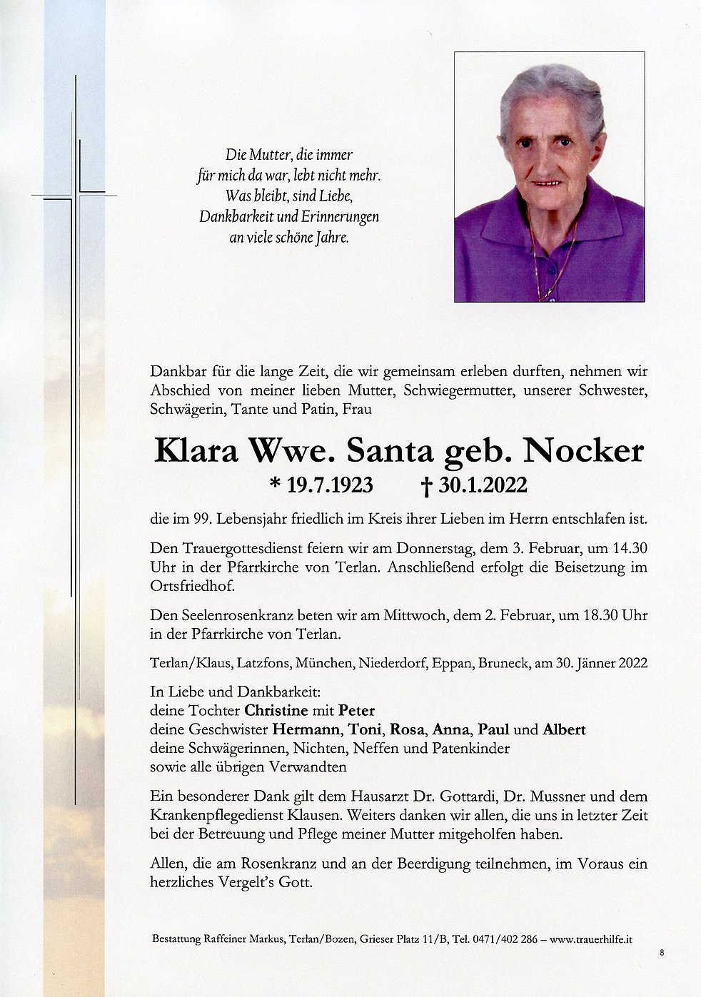 Den Trauergottesdienst feiern wir am Donnerstag, dem 3. Februar, um 14.30 Uhr in der Pfarrkirche von Terlan. Anschließend erfolgt die Beisetzung im Ortsfriedhof.