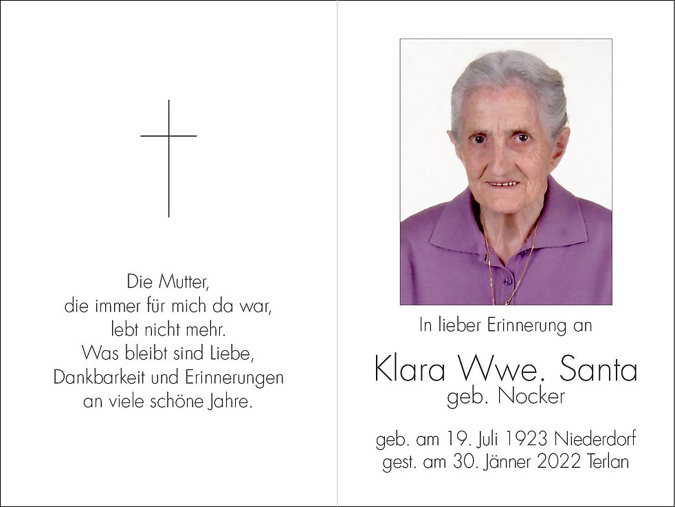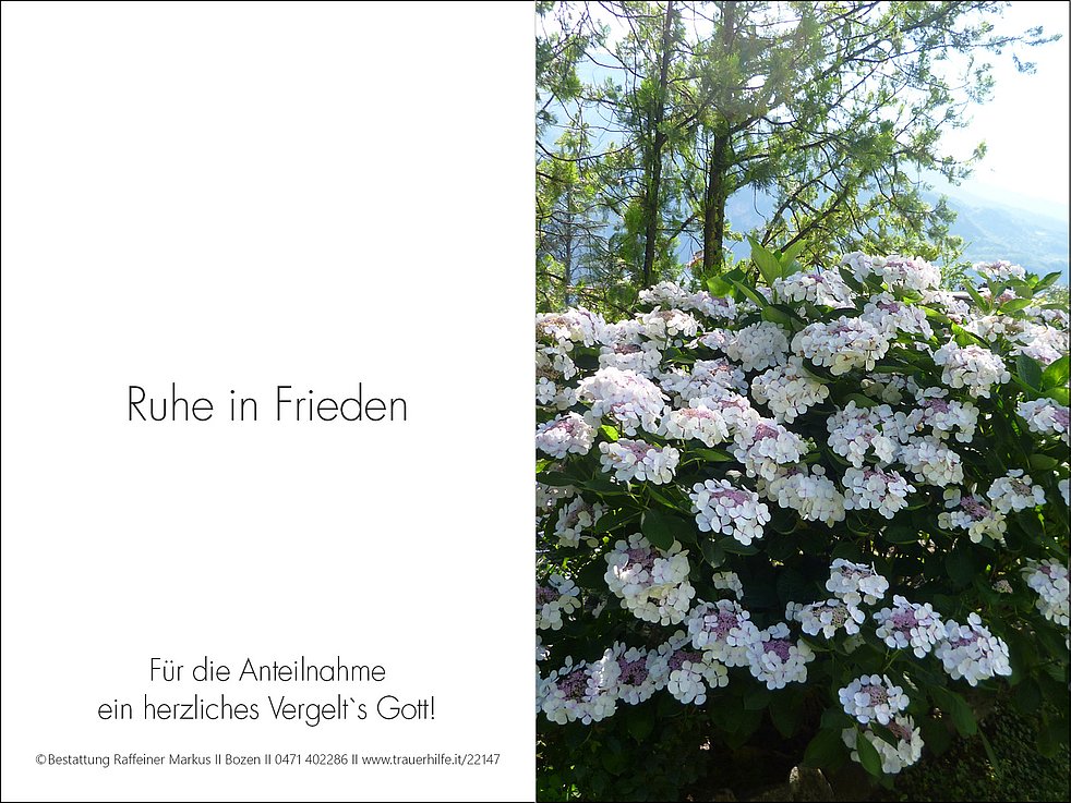 Ein besonderer Dank gilt dem Hausarzt Dr. Gottardi, Dr. Mussner und dem Krankenpflegedienst Klausen. Weiters danken wir allen, die uns in letzter Zeit bei der Betreuung und Pflege meiner Mutter mitgeholfen haben.