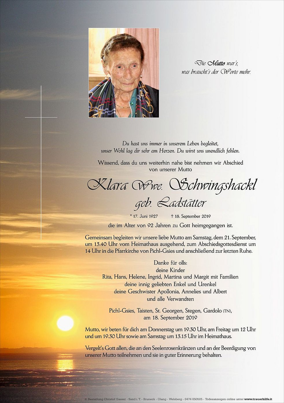 Gemeinsam begleiten wir unsere liebe Mutto am Samstag, dem 21. September, um 13.40 Uhr vom Heimathaus ausgehend, zum Abschiedsgottesdienst um 14 Uhr in die Pfarrkirche von Pichl-Gsies und anschließend zur letzten Ruhe.