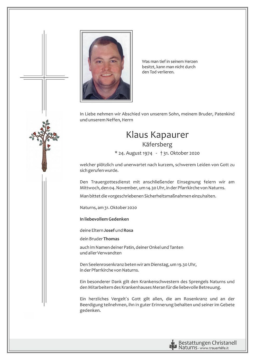 Den Trauergottesdienst mit anschließender Einsegnung feiern wir am Mittwoch, den 04. November, um 14.30 Uhr, in der Pfarrkirche von Naturns.