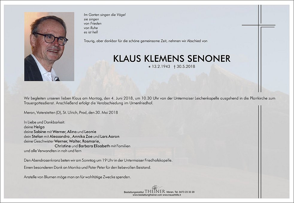 Wir begleiten unseren lieben Klaus am Montag, den 4. Juni 2018, um 10.30 Uhr von der Untermaiser Leichenkapelle ausgehend in die Pfarrkirche zum Trauergottesdienst. Anschließend erfolgt die Verabschiedung im Urnenfriedhof.